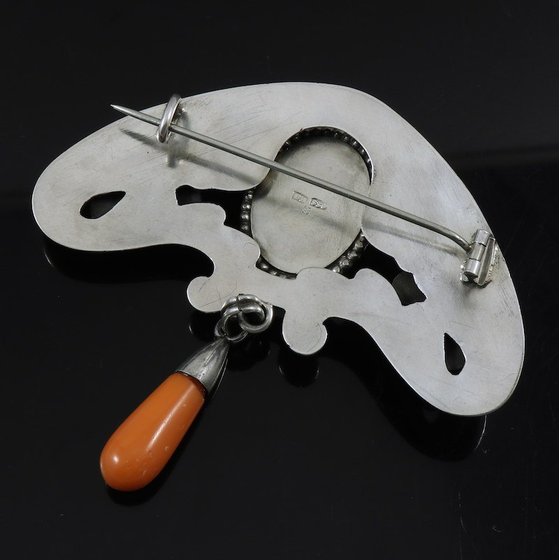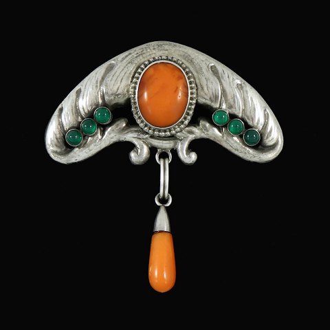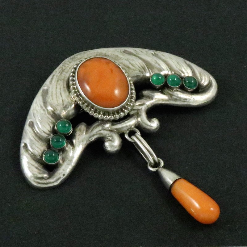 Bernhard Hertz. Skønvirke Broche i Sølv med rav og grøn agat.