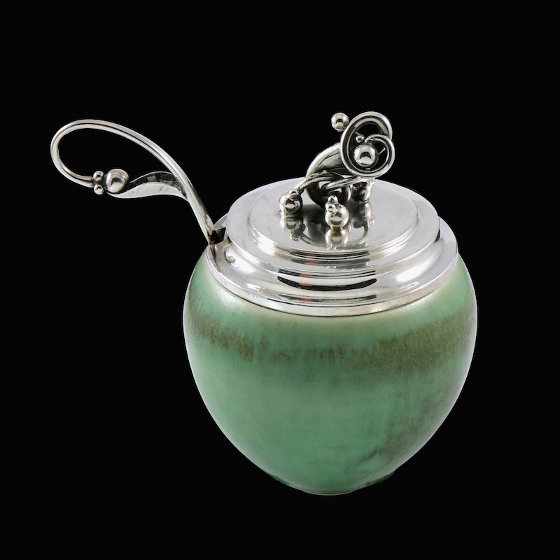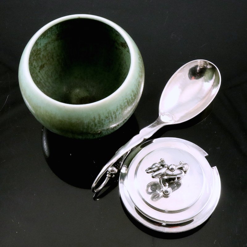Saxbo - F. Hingelberg - Georg Jensen. Stoneware Jar with Sterling Silver Lid and Spoon.