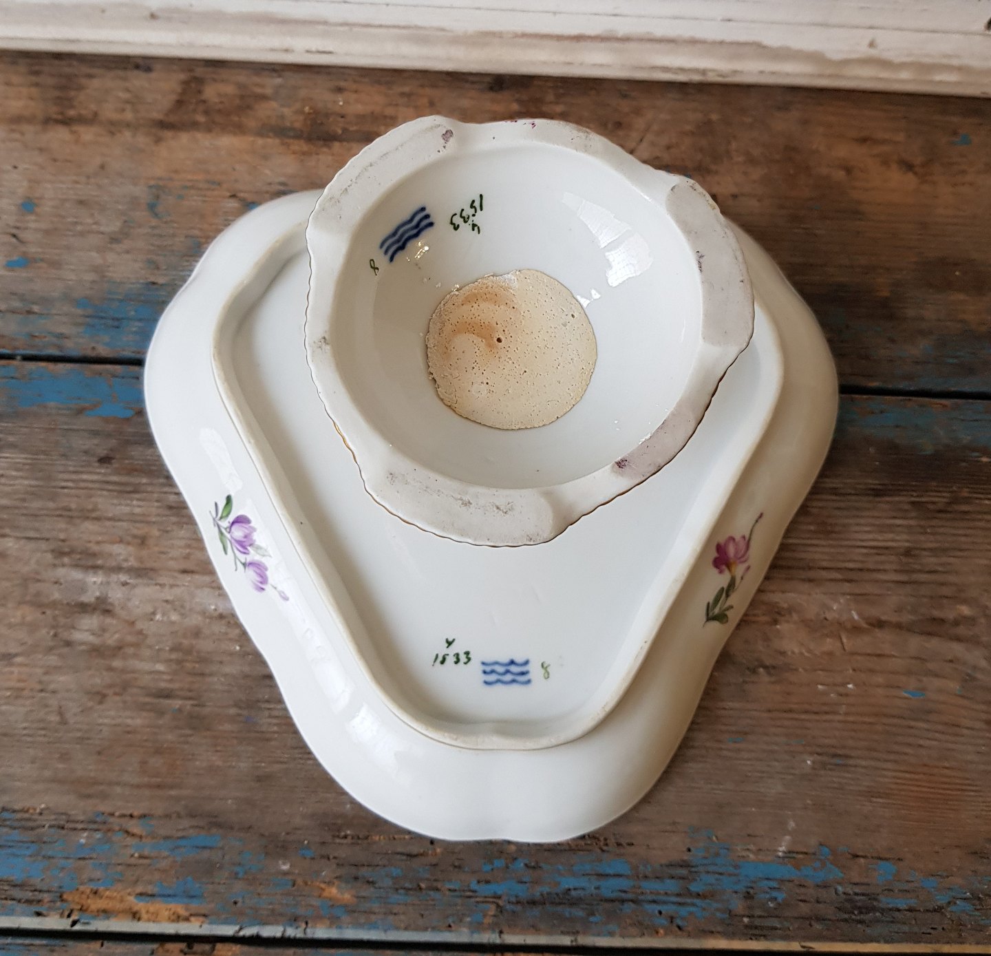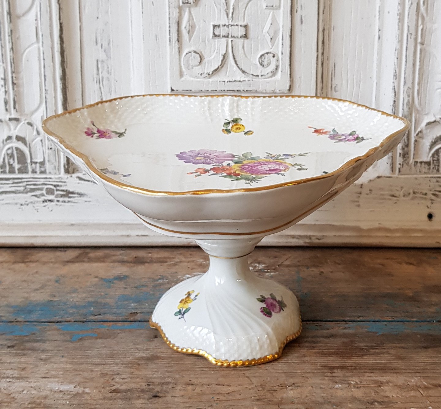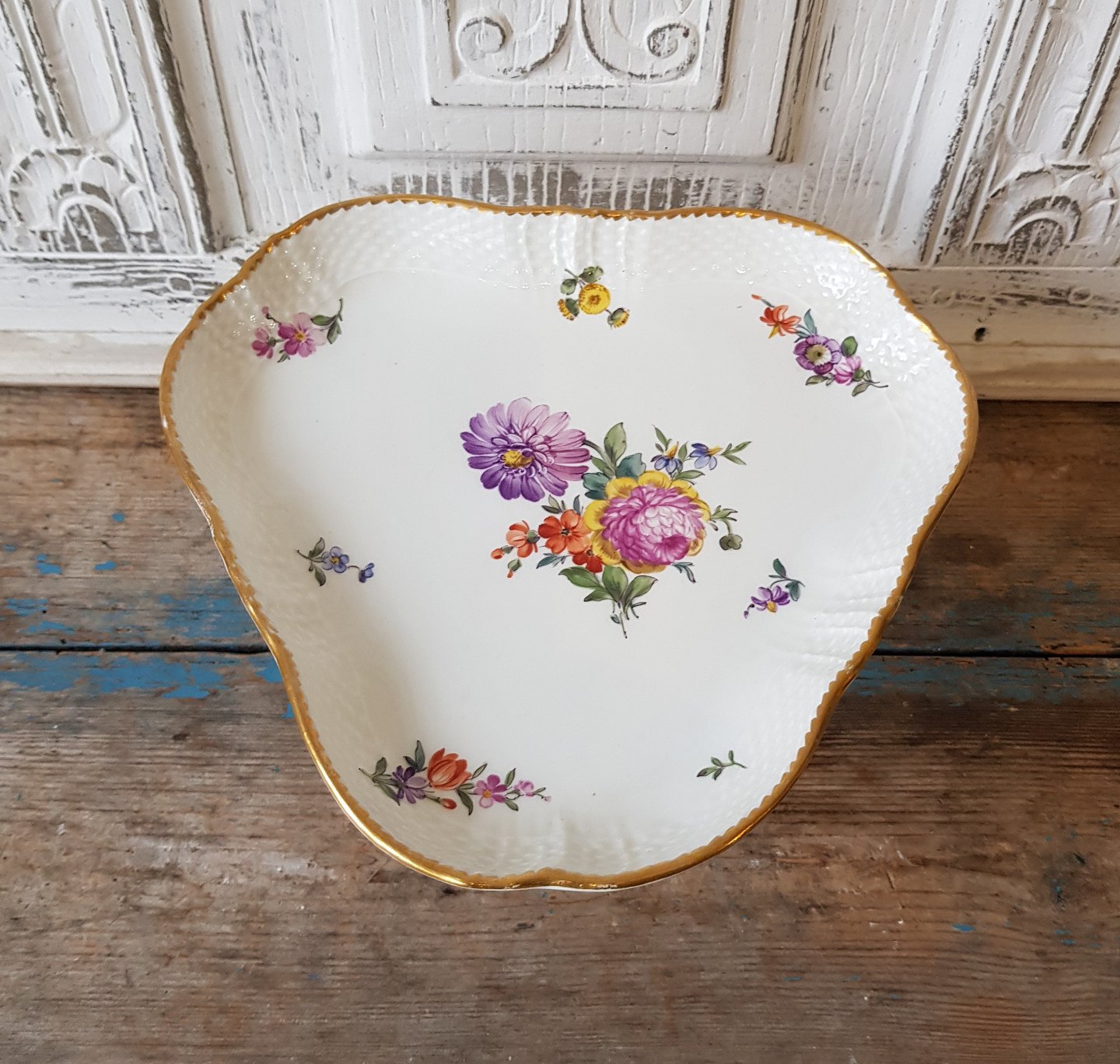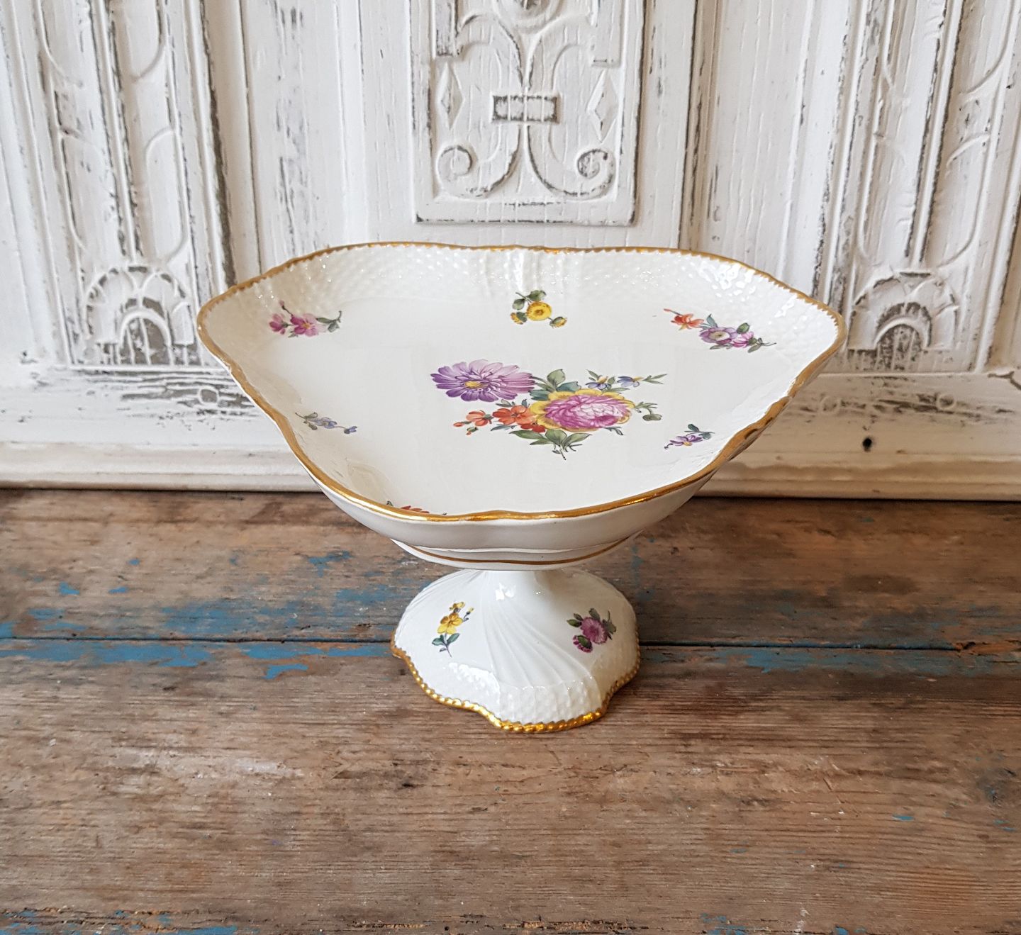 Royal Copenhagen Fuld Saksisk blomst trekantet kagefad på fod no. 1533