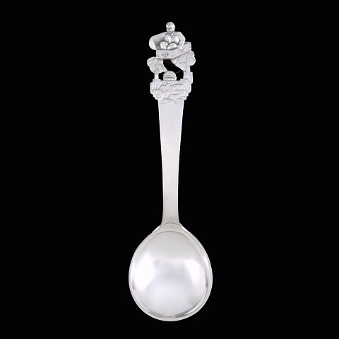 H.C. Andersen Eventyrbestik. 'Den Flyvende Kuffert'. Rund barne/dessertske i sølv med motiv fra H.C. Andersens eventyr. L. 14,5 cm.