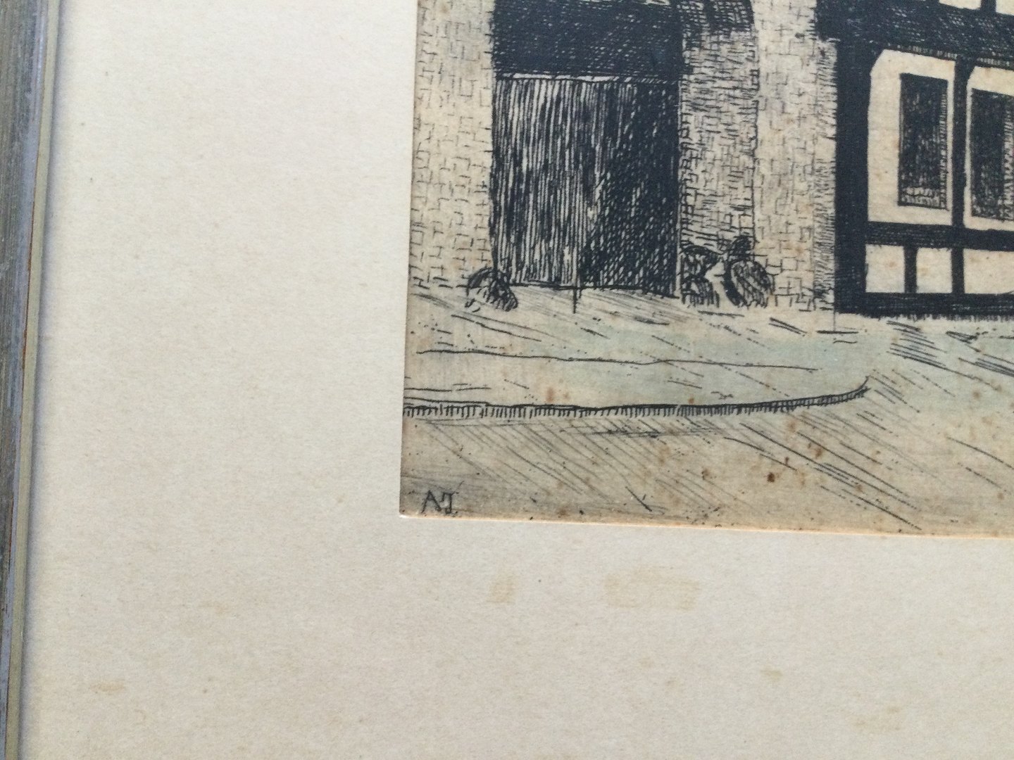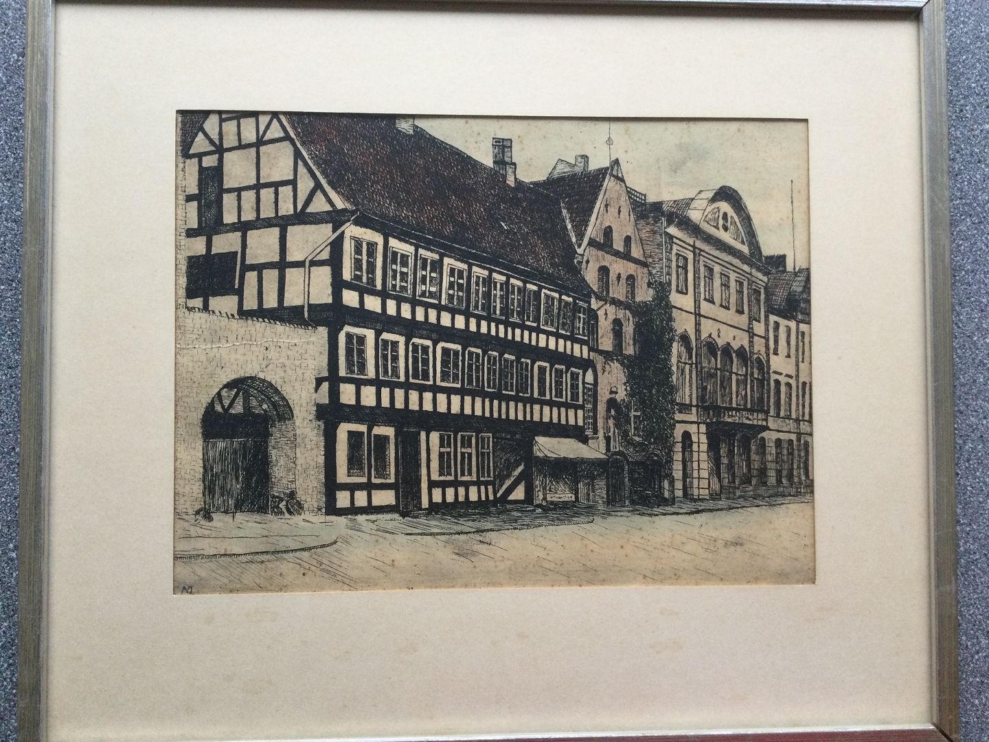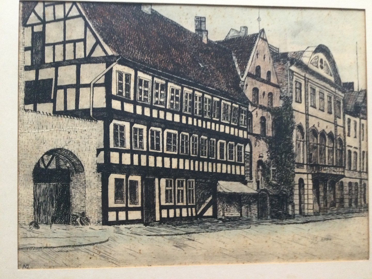 Text zugänglich auf Dänische: Radering af Albert Jensen - Jørgen Olufsens Gaard, Østeraa, Aalborg.