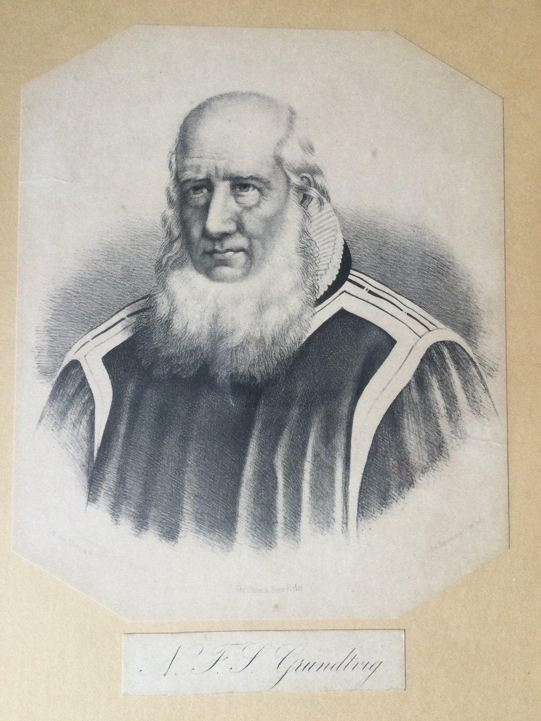 Text zugänglich auf Dänische: Portræt salmedigteren N.F.S. Grundtvig 1866 - litografi af Em. Bærentzen.
