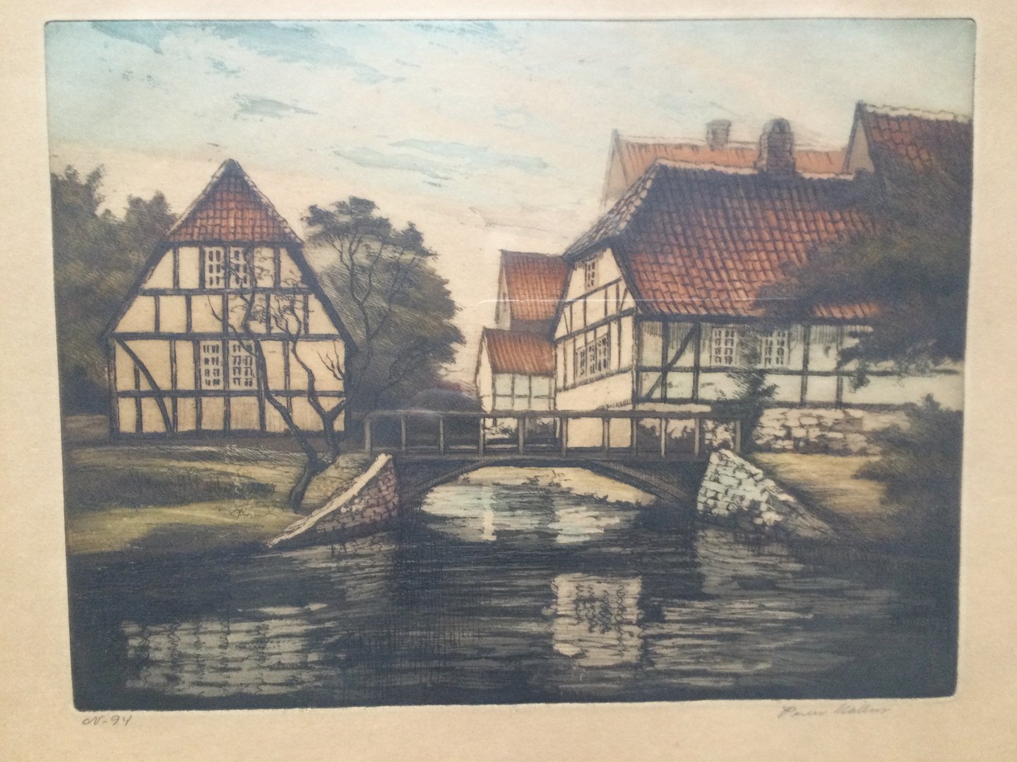 Farveradering af Peder Møller - Gamle huse ved vandløb.