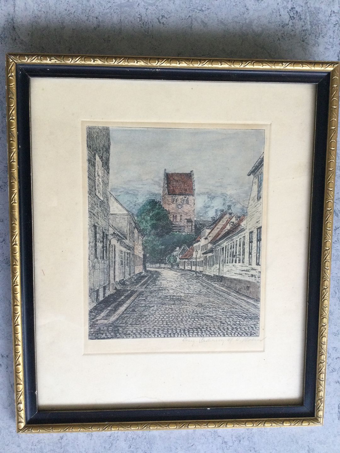 Radering af V. Holm - Parti fra Køge med kirken i baggrunden.