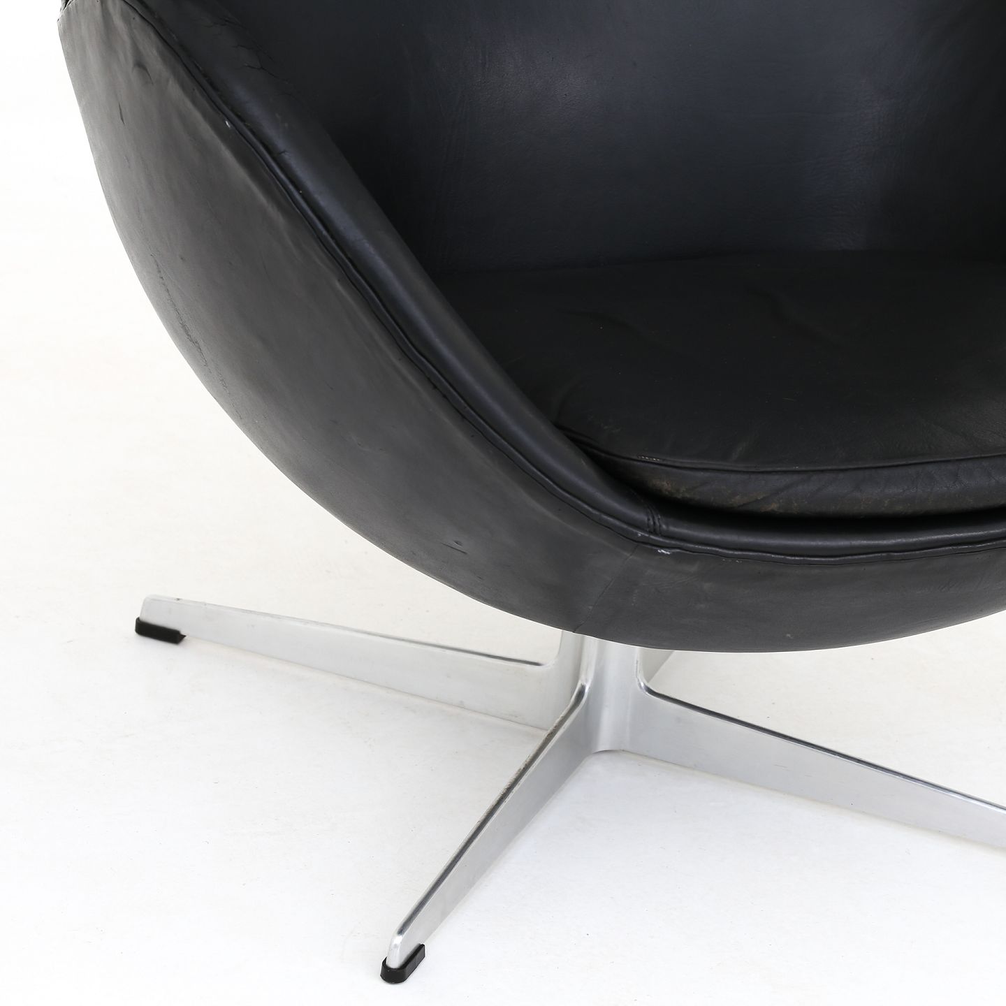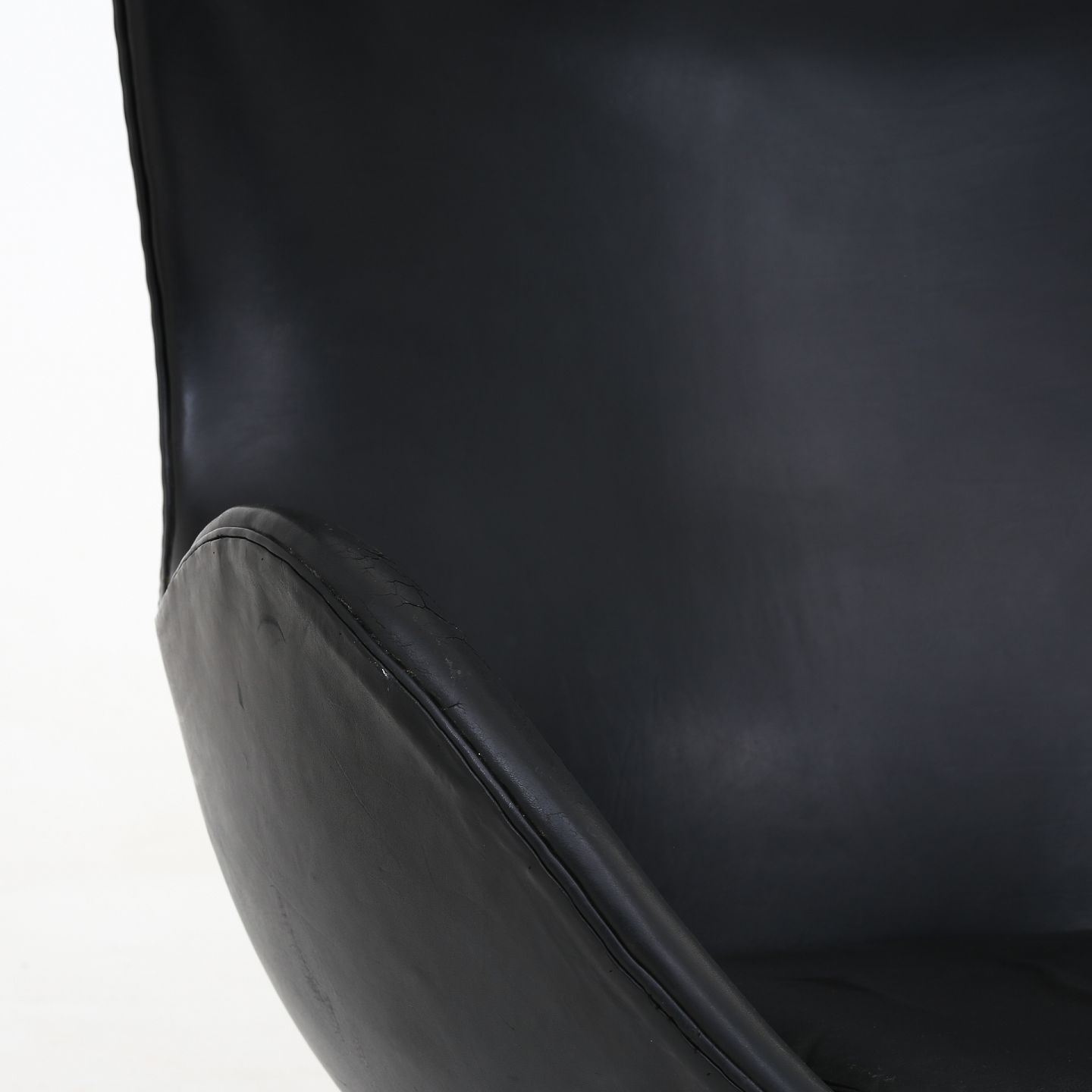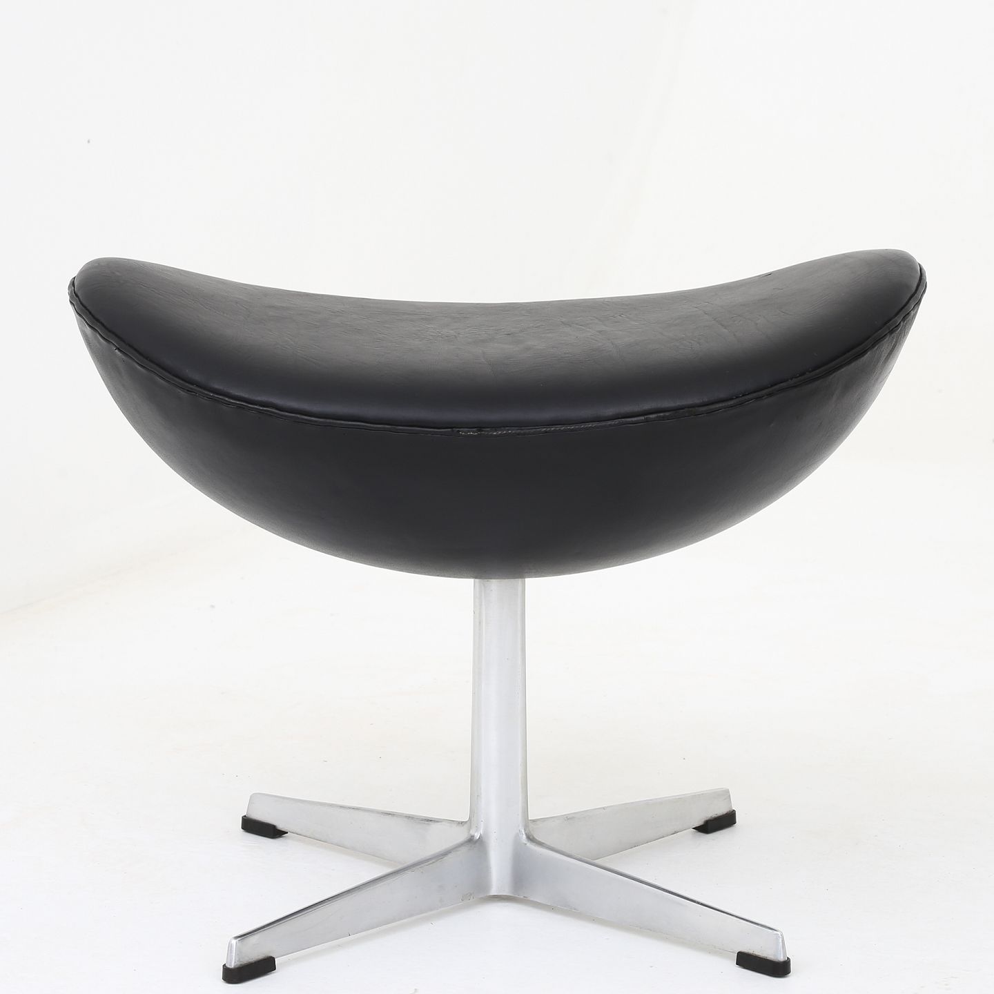 AJ 3316 - 'Ægget' lænestol m. skammel i originalt, sort læder på gammel fod af aluminium.