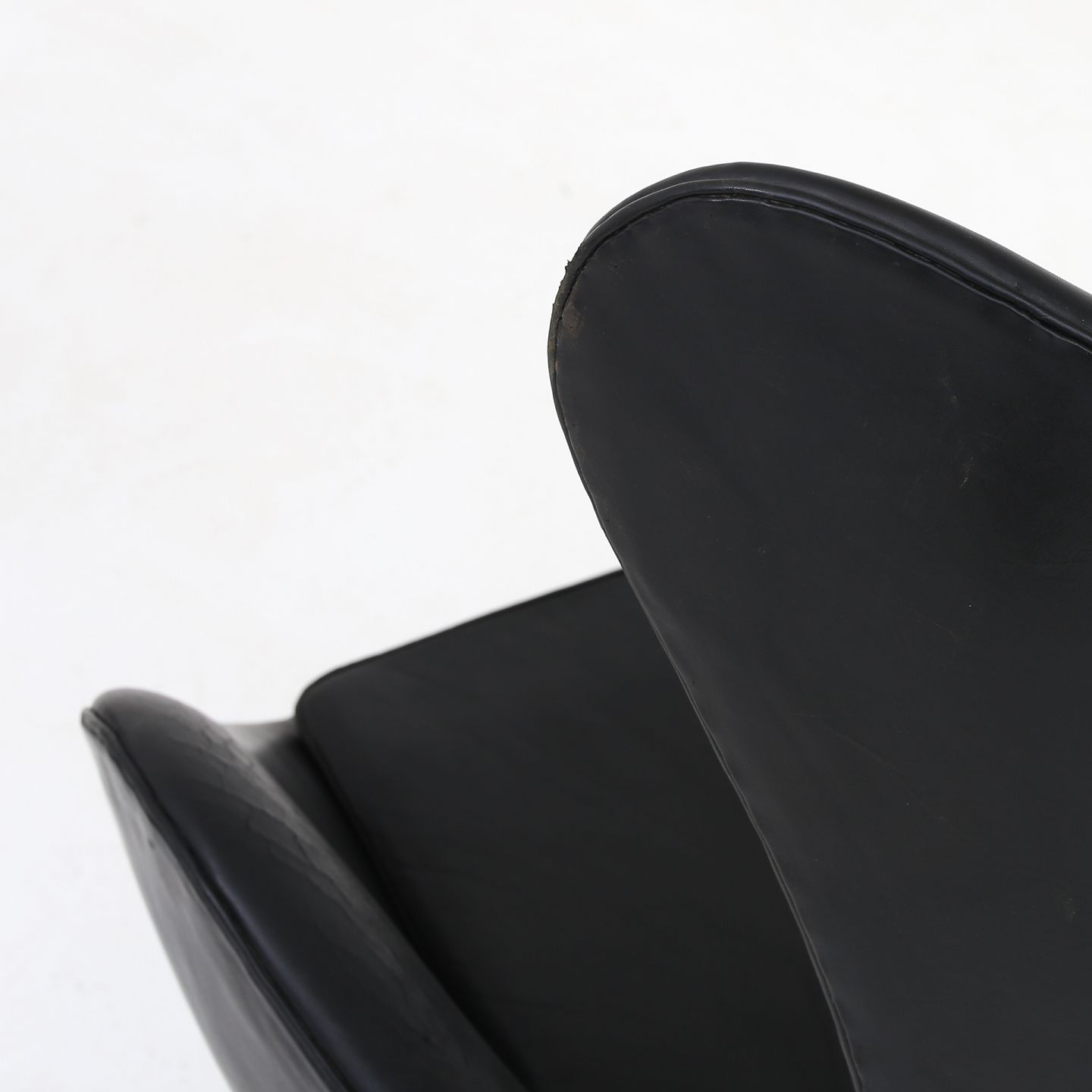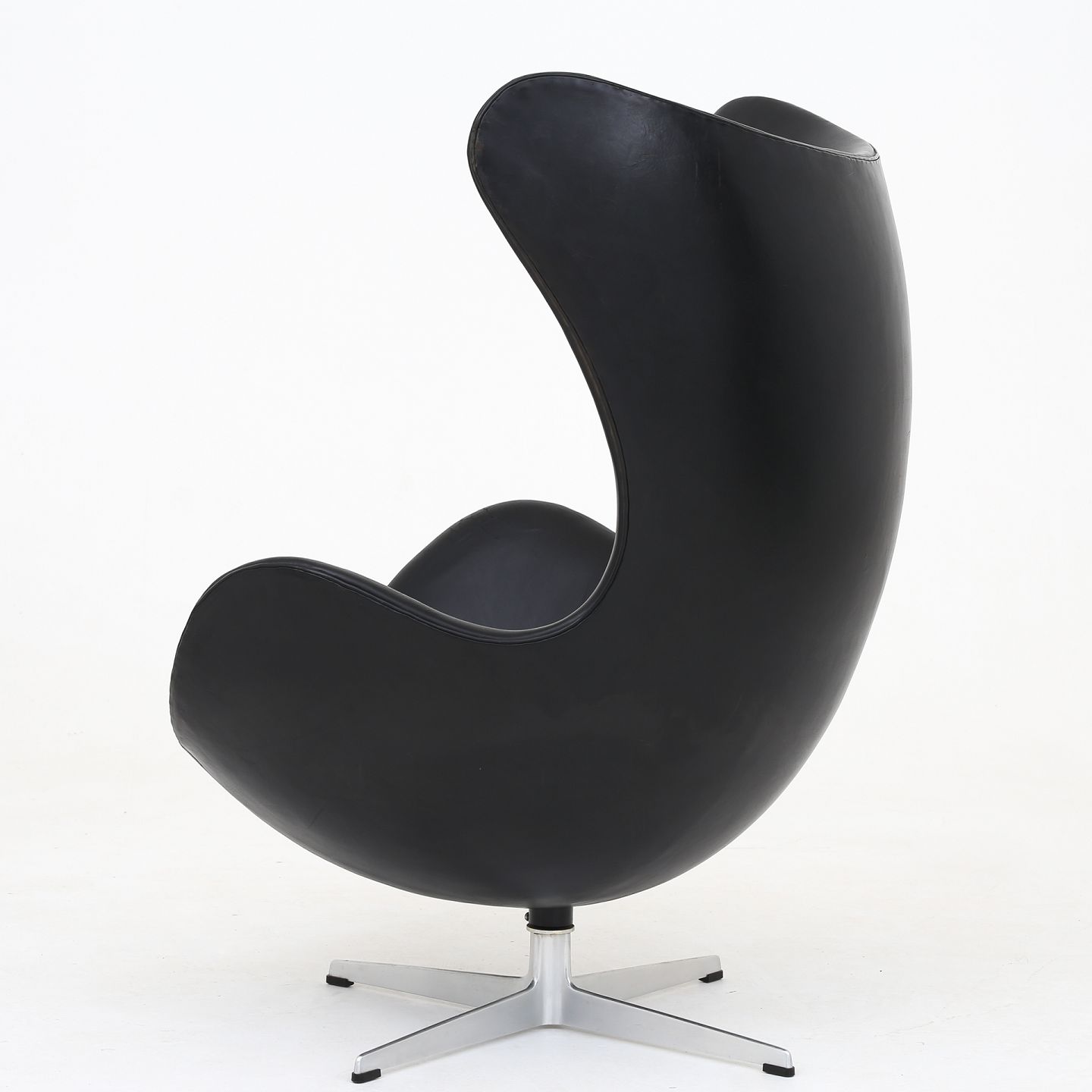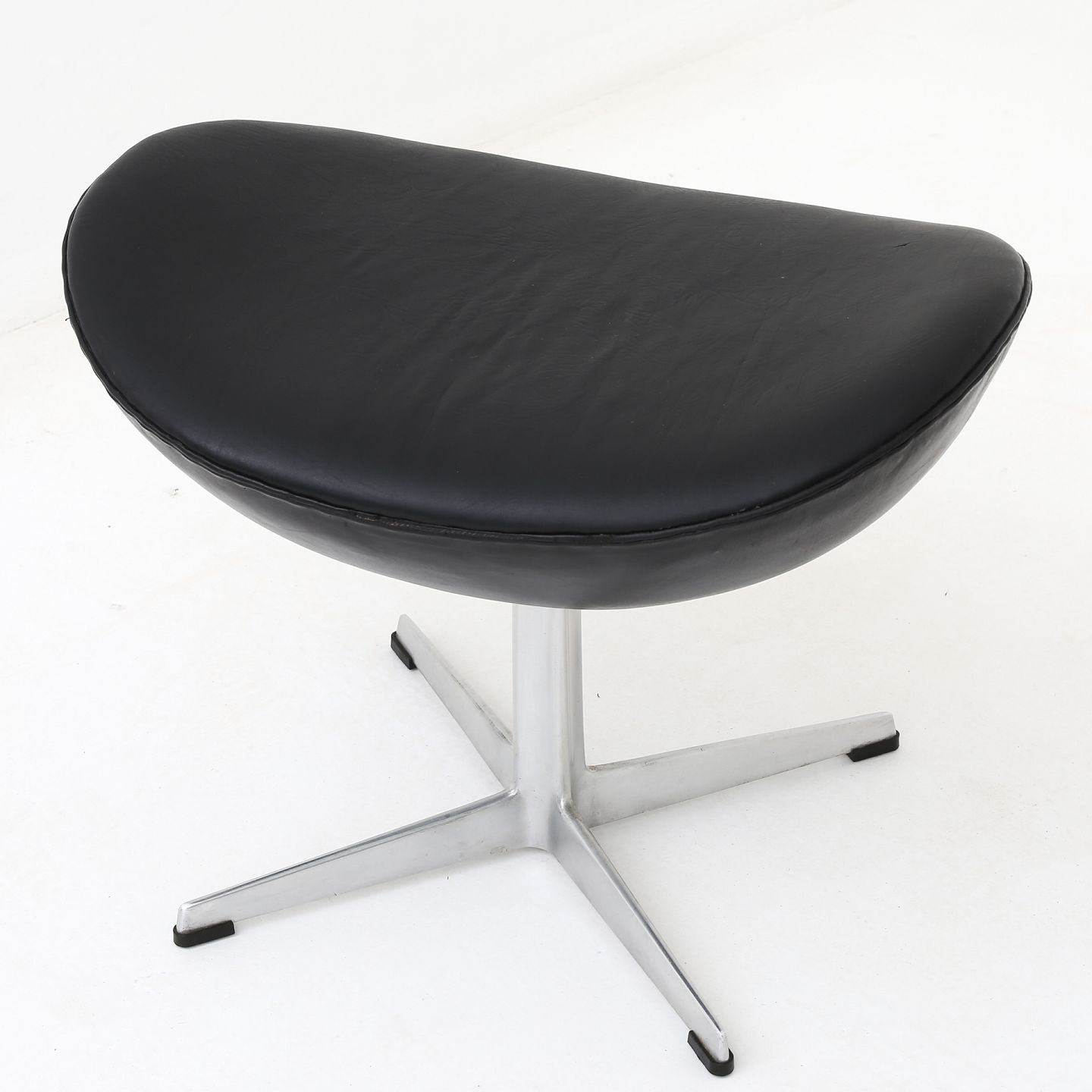 AJ 3316 - 'Ægget' lænestol m. skammel i originalt, sort læder på gammel fod af aluminium.