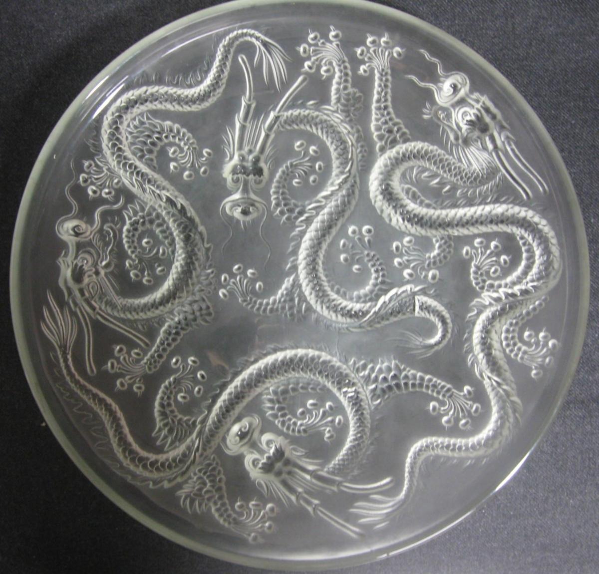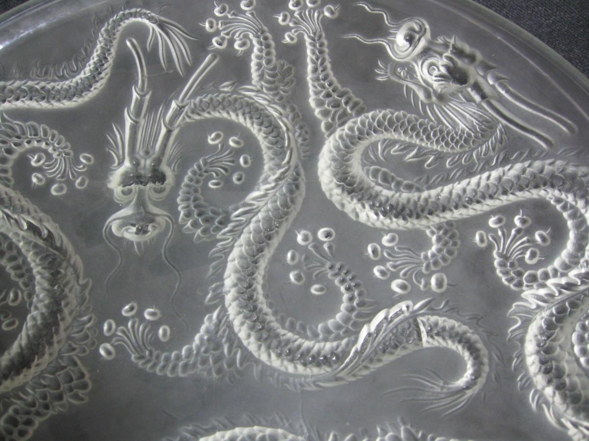 Lalique fad, Frankrig, ca.1930. Presset glas, dekoreret med drager. Dia.: 36 cm.