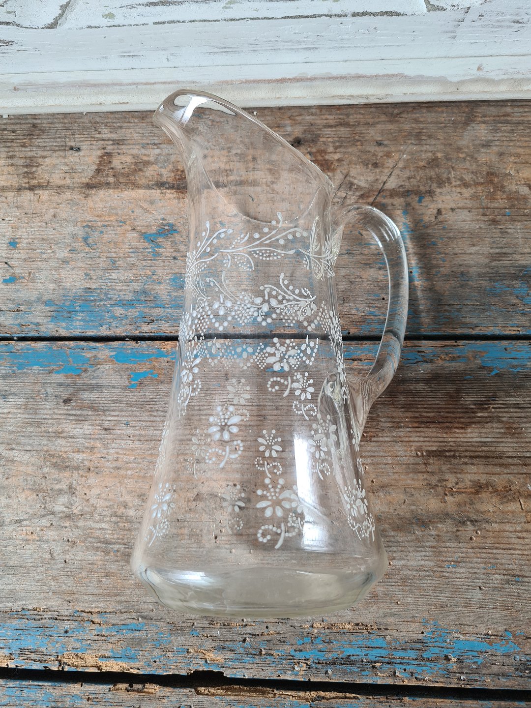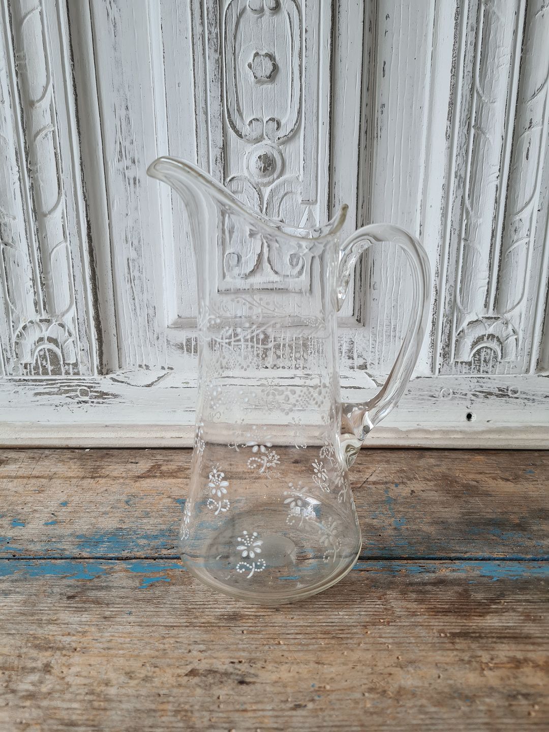 Smuk gammel glaskande med hvid emalje dekoration