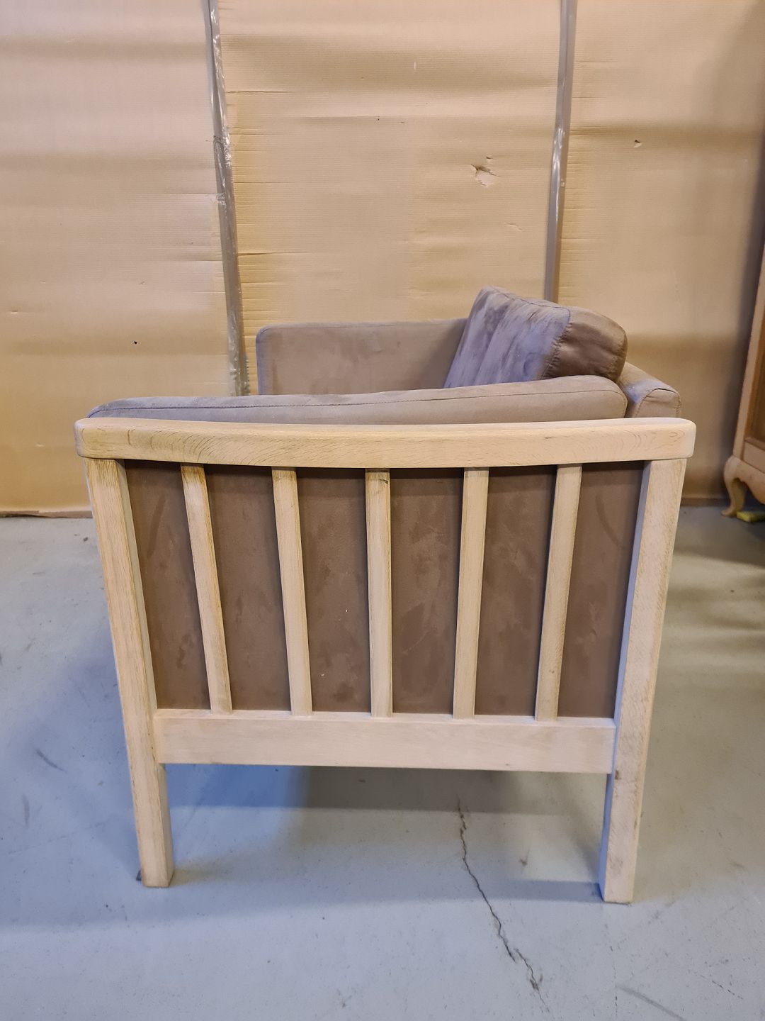 Sofa i massivt egetræ med kunst ruskind, fra 2000erne.