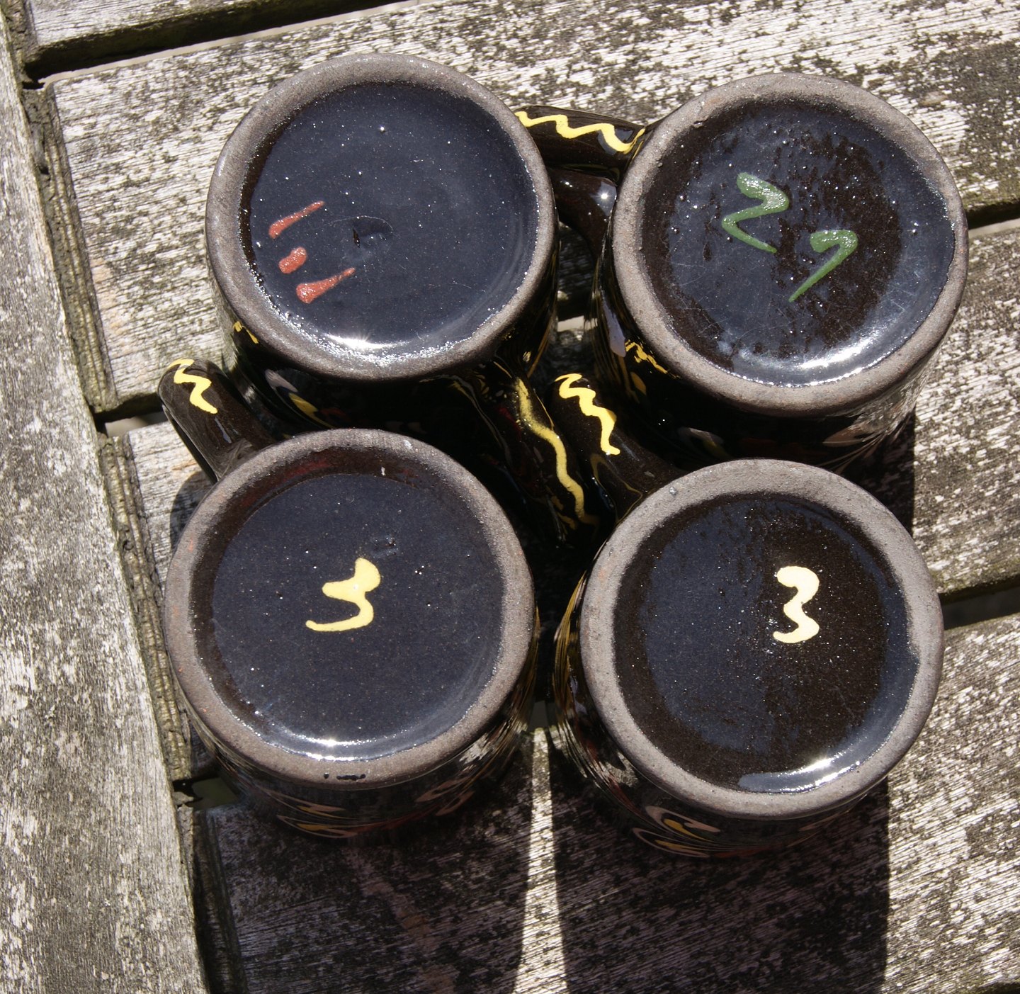 Sæt = 4 små krus med hank og med sort glasur samt dekoration, se ekstra fotos. De er alle i pæn stand.