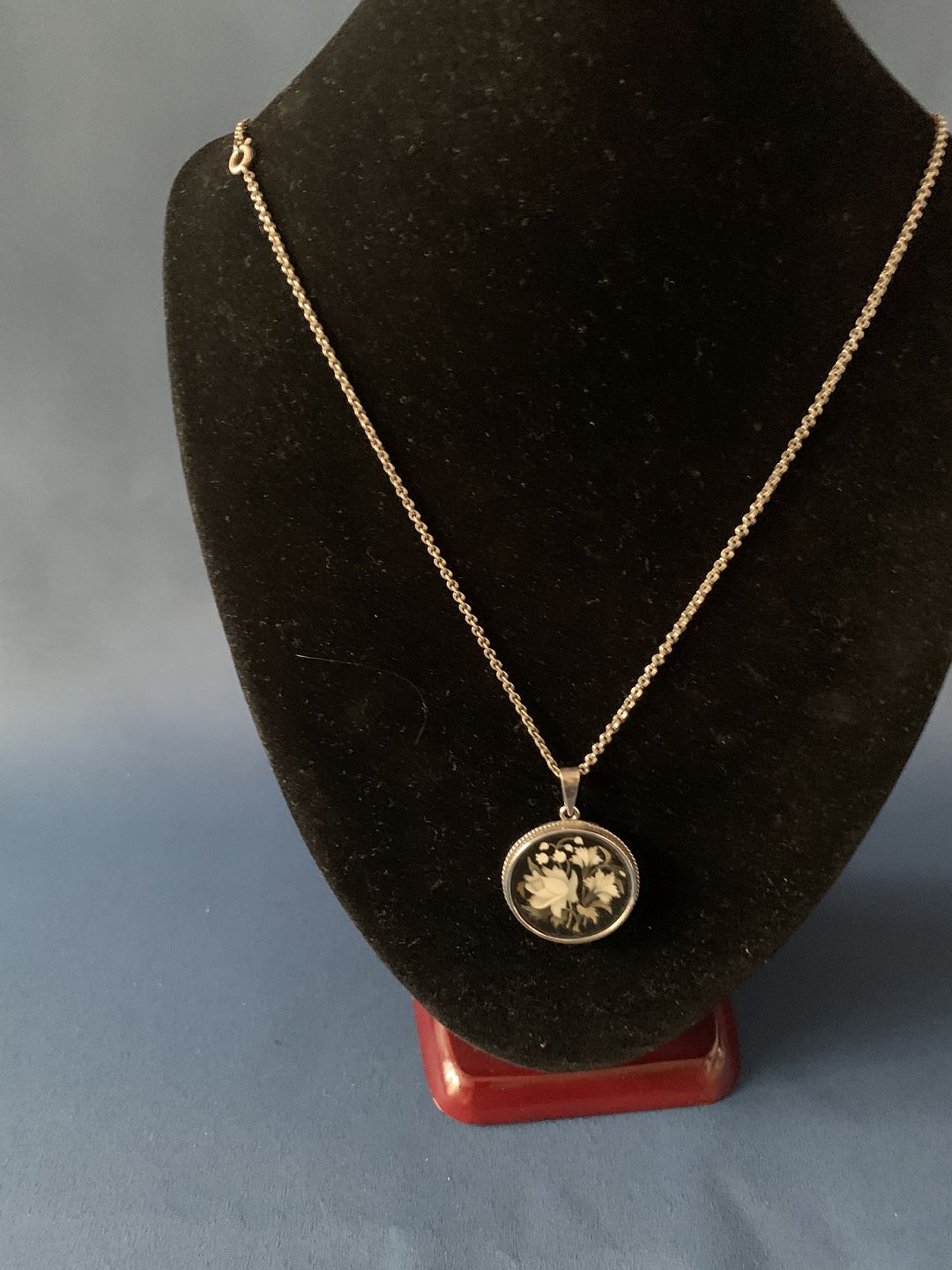 Beautiful silver chain with pendant. The pendant has an inlaid floral motif. The pendant's beautiful motif and design make this piece of jewelery very elegant to wear. The flowers in the pendant are made in great detail.