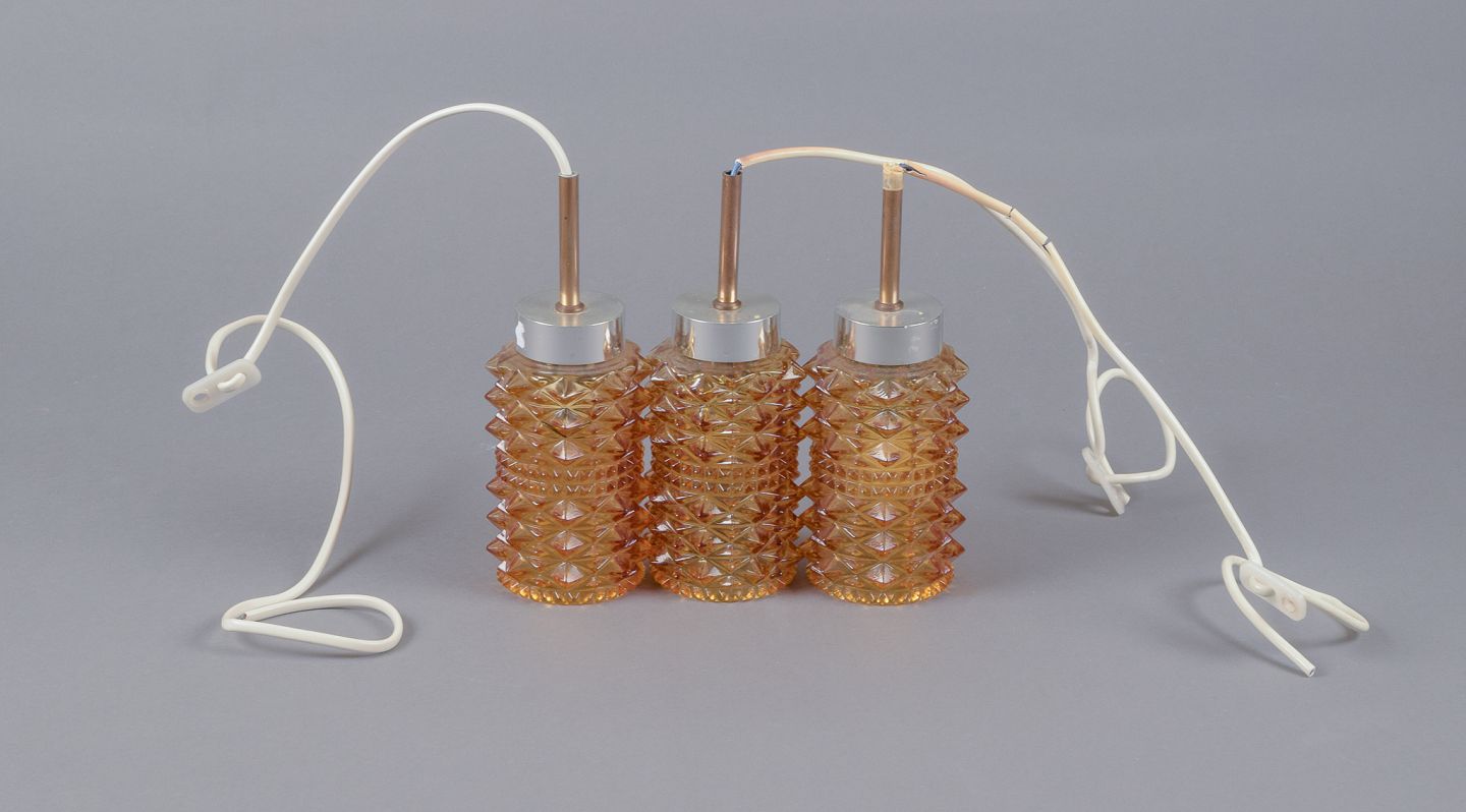 Three small ceiling lamps in stainless steel and smoke-colored glass.