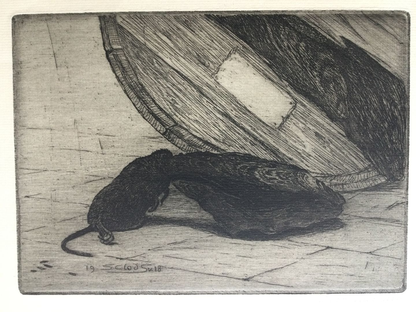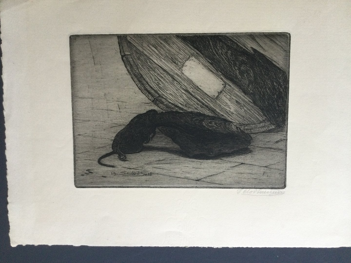 Radering af Sophus Clod-Svensson - Mus fanget af Musling 1918.