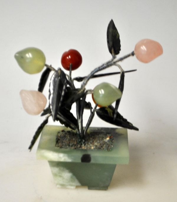 Kinesisk jade busk, 20. årh. Udformet som busk med forskellig farvede jader i kumme af jade. Højde.: 9 cm.