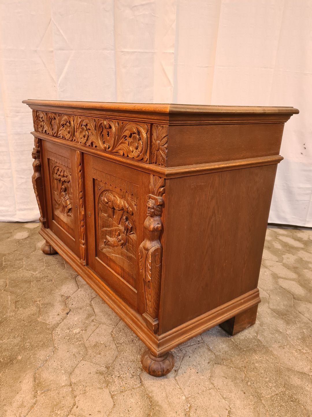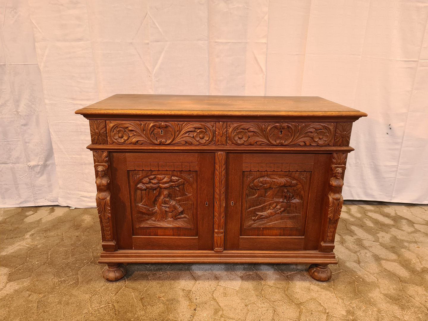 Anretterskab i fineret og massivt egetræ med motiver af Hamlet, fra 1930erne.
