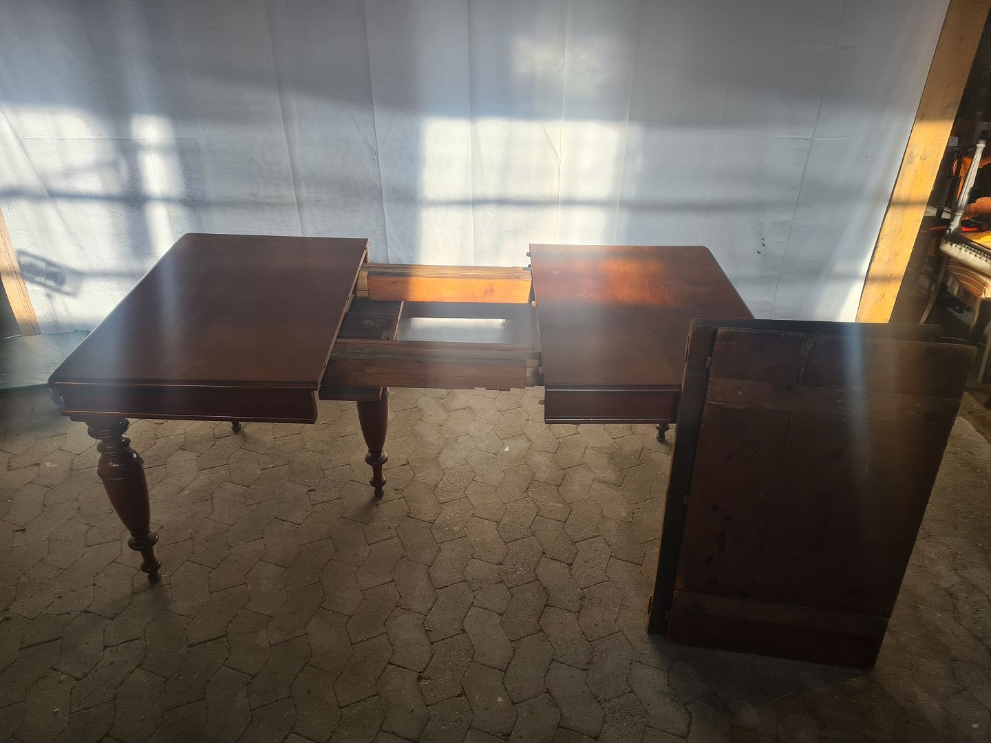 Spisebord i mahogni og bøgetræ med 2 tillægsplader, fra 1900erne.