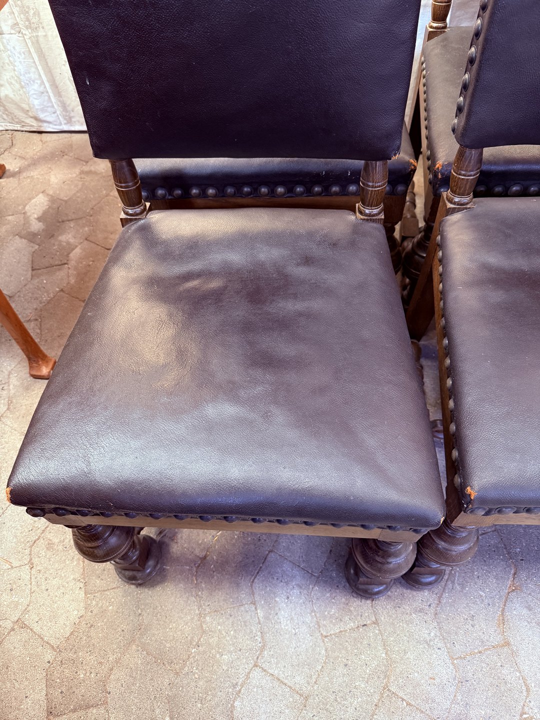 8 Stole i rænnessance stil i massivt egetræ med læderbetræk, fra 1930erne.