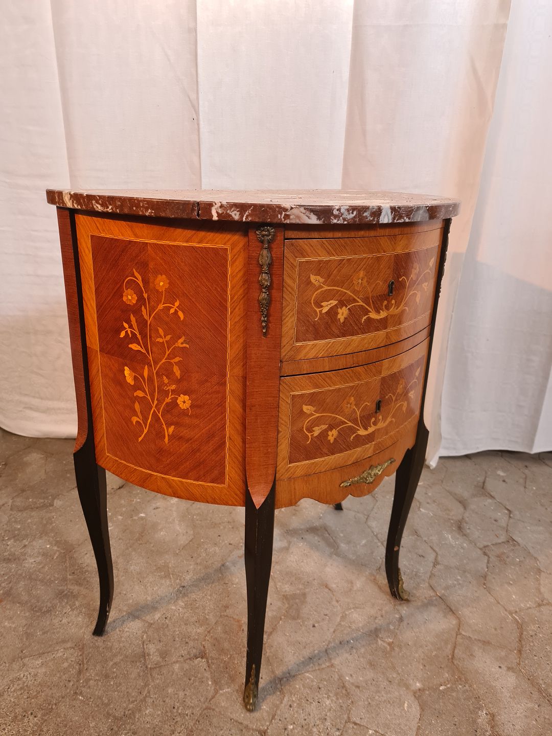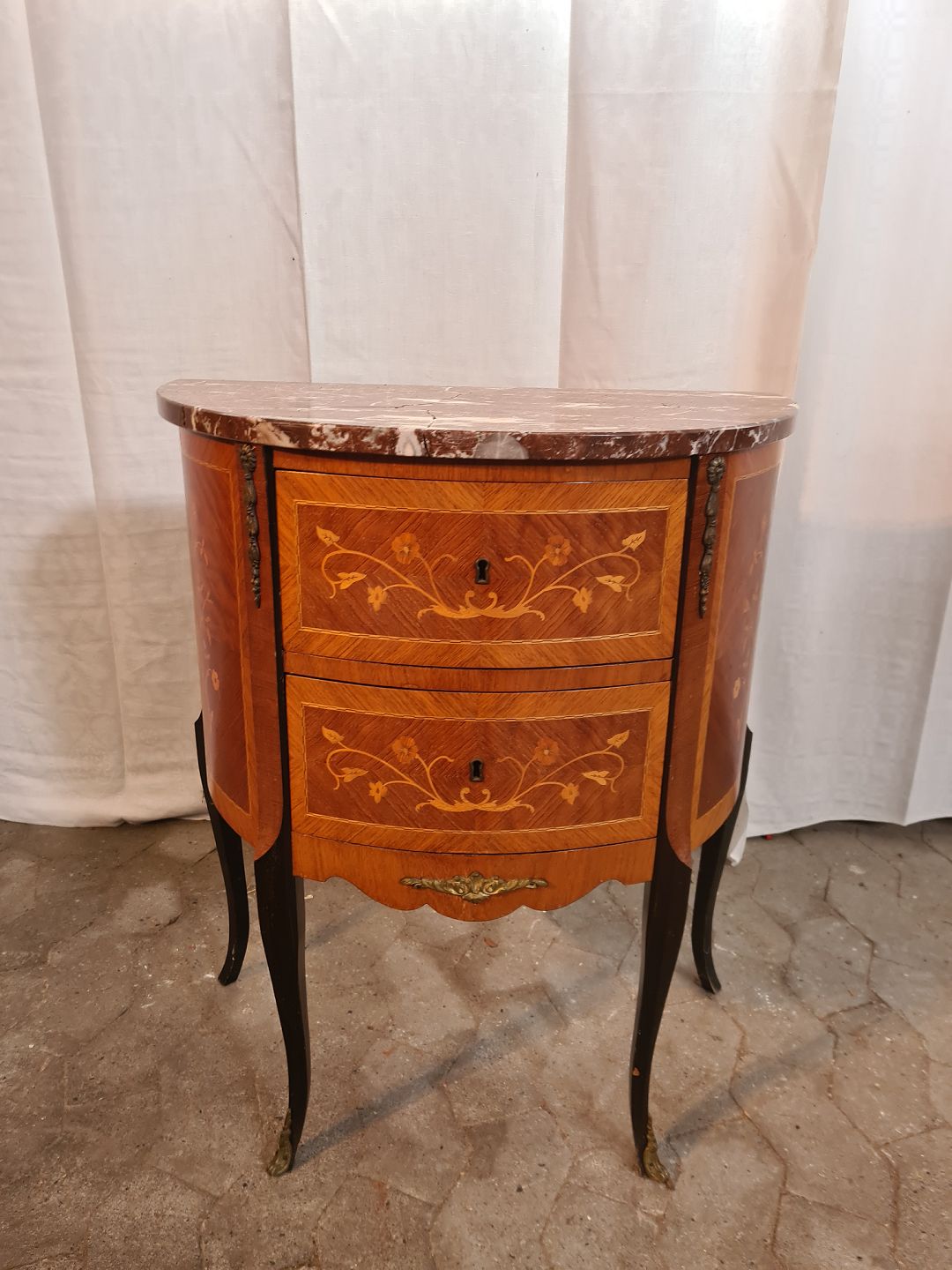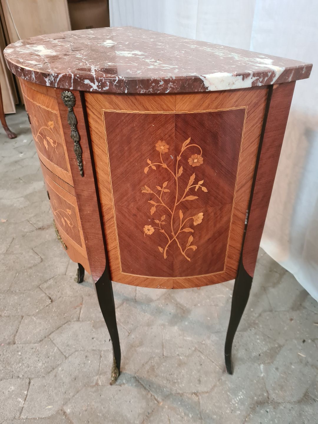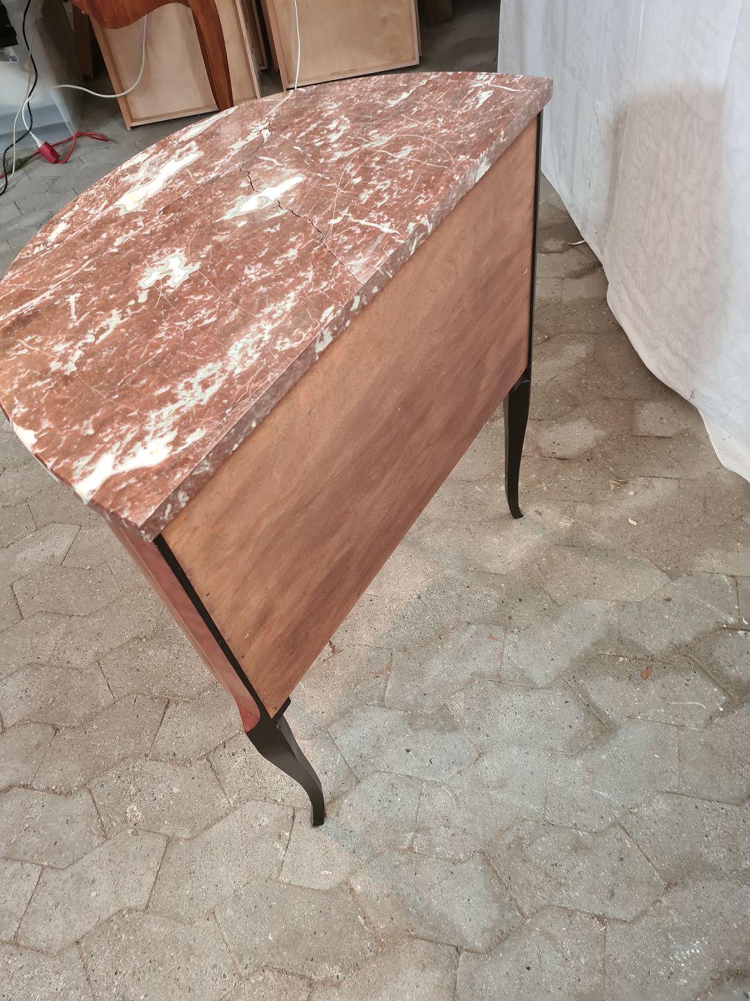 Kommode i fineret mahogni med intasia og marmorplade, fra 1980erne.