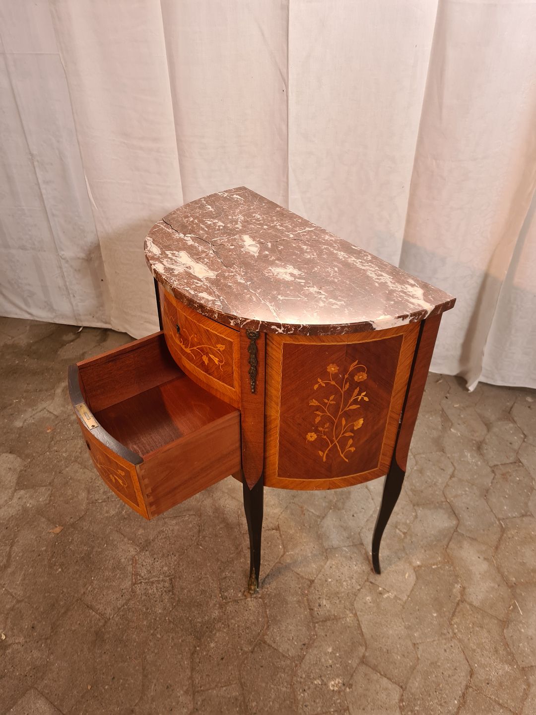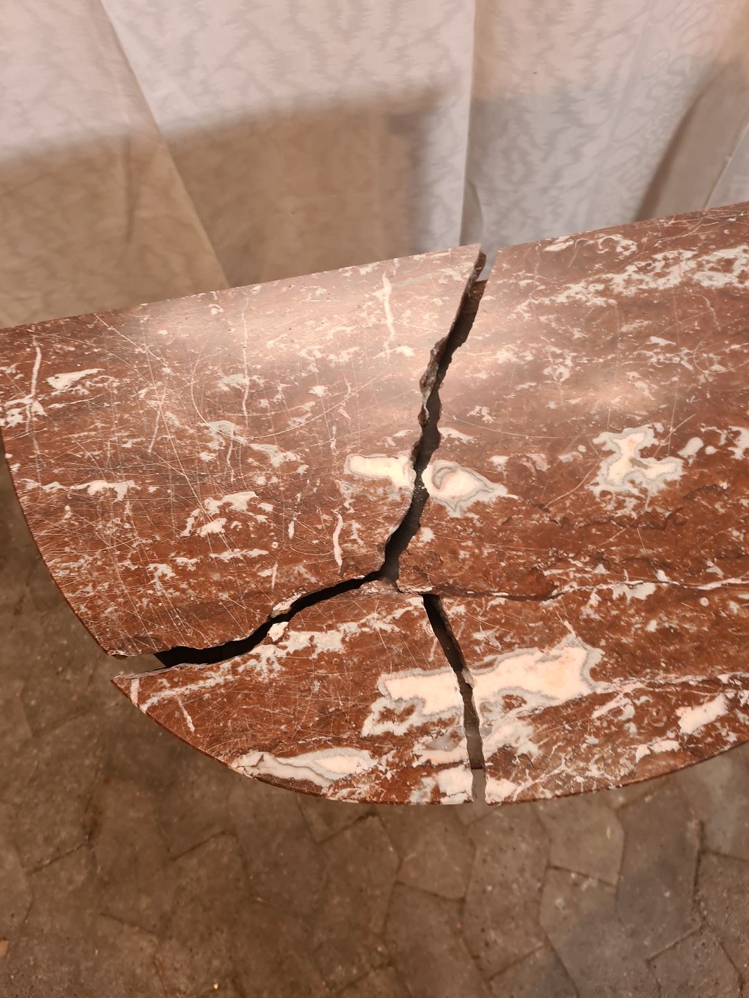 Den har brugsspor og marmorpladen er defekt.