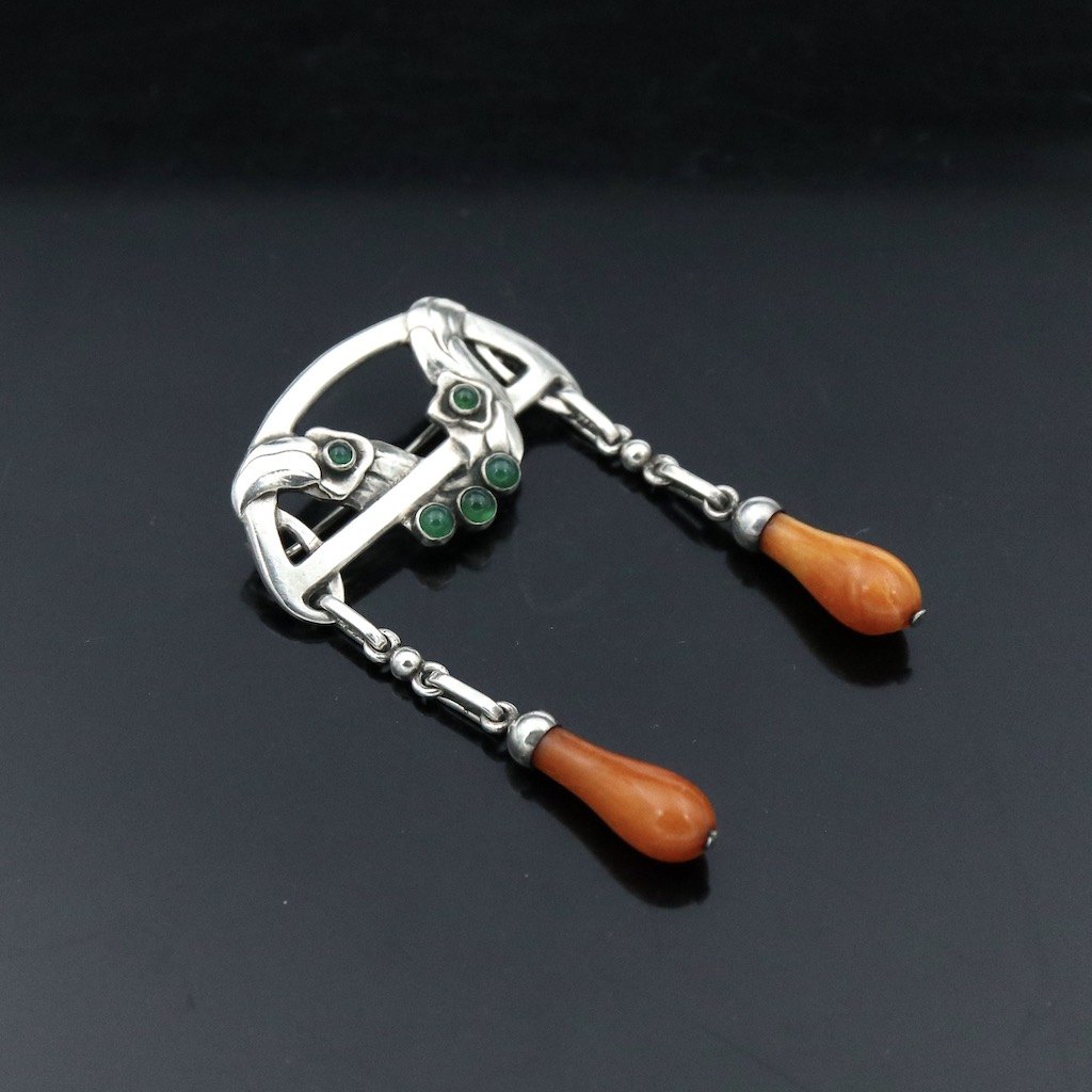 Georg Jensen. Broche i 826s sølv med agat og rav. 1907-14 stempler.