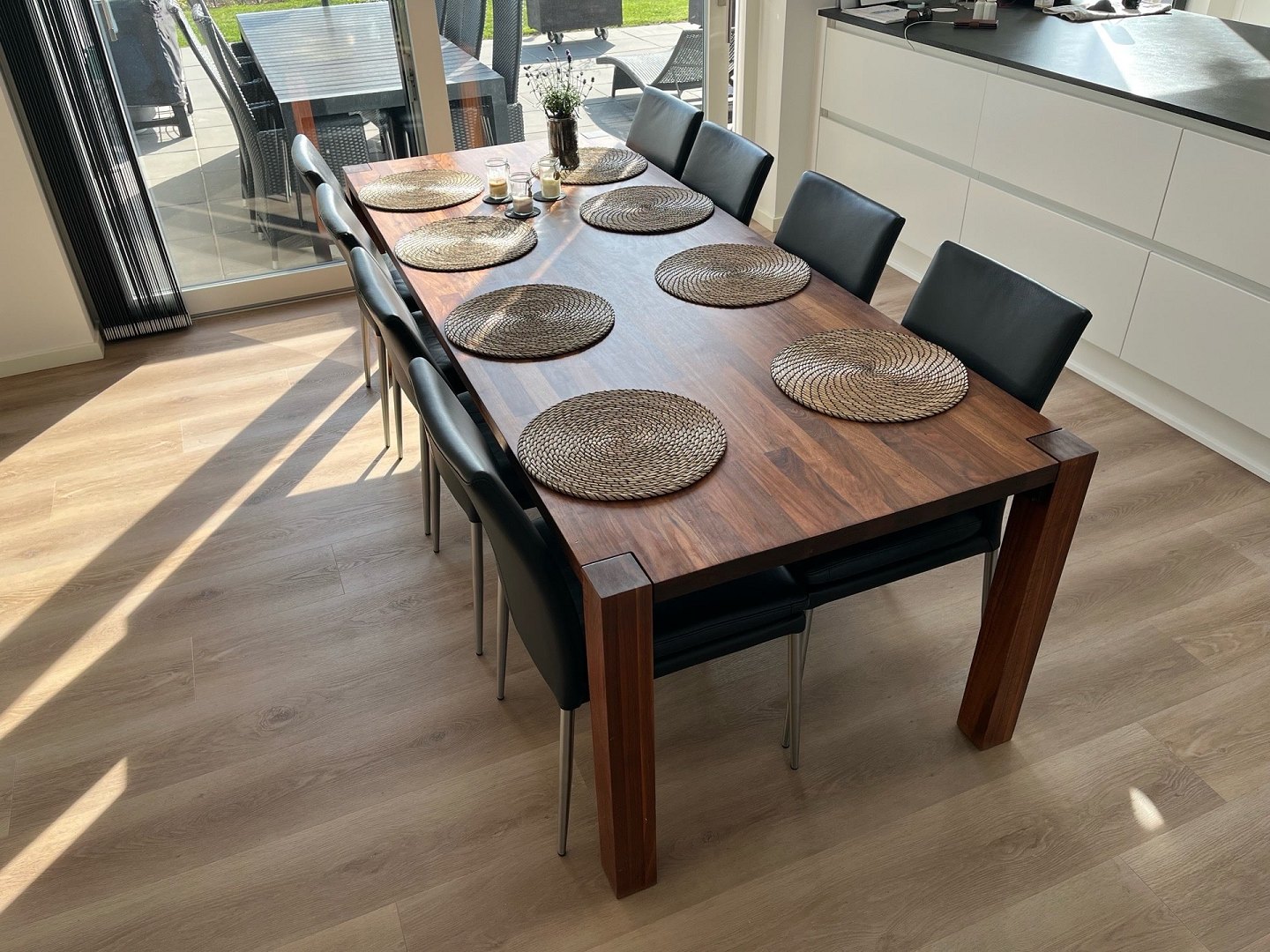 Hand-built custom-made dining table in walnut. The table is built by a cabinetmaker who knows what quality is, the table top is reinforced with iron pieces that are milled into the table top. The table has removable legs. The table is cleaned and oiled and ready for delivery. Table measurements. Length 230 cm. Width 90 cm. Height 73 cm. Our concept. Purchase of newer/used furniture. Thorough cleaning and treatment. Viewing by appointment. Delivery for a fee throughout Denmark. See also our other designer furniture from, among others, Poul Kjørholm, Mogens Hansen, Søren Lund, Arne Jacobsen, Jørgen Gammelgaard, Nielaus, Skalma, Fritz Hansen, Cph, Skovby, Boconcept, and many others on our website Mrretrodesign.dk