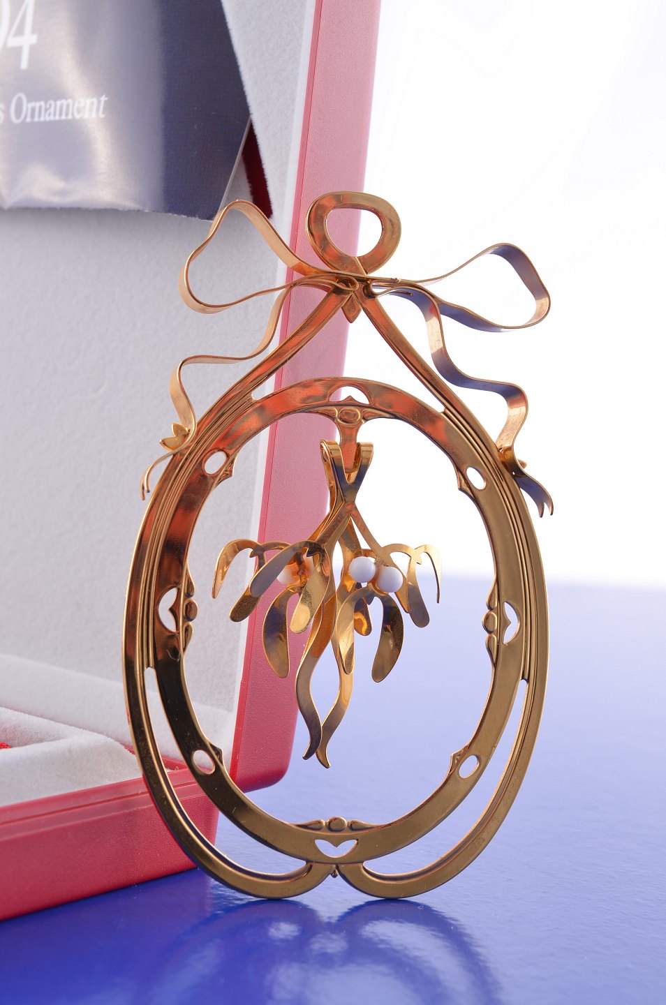 Georg Jensen Julepynt. Juleuroen år 1994 med mistelten motiv, forgyldt messing. Designet af kunstneren, Jette Frölicb. Pæn velholdt stand, med æske.