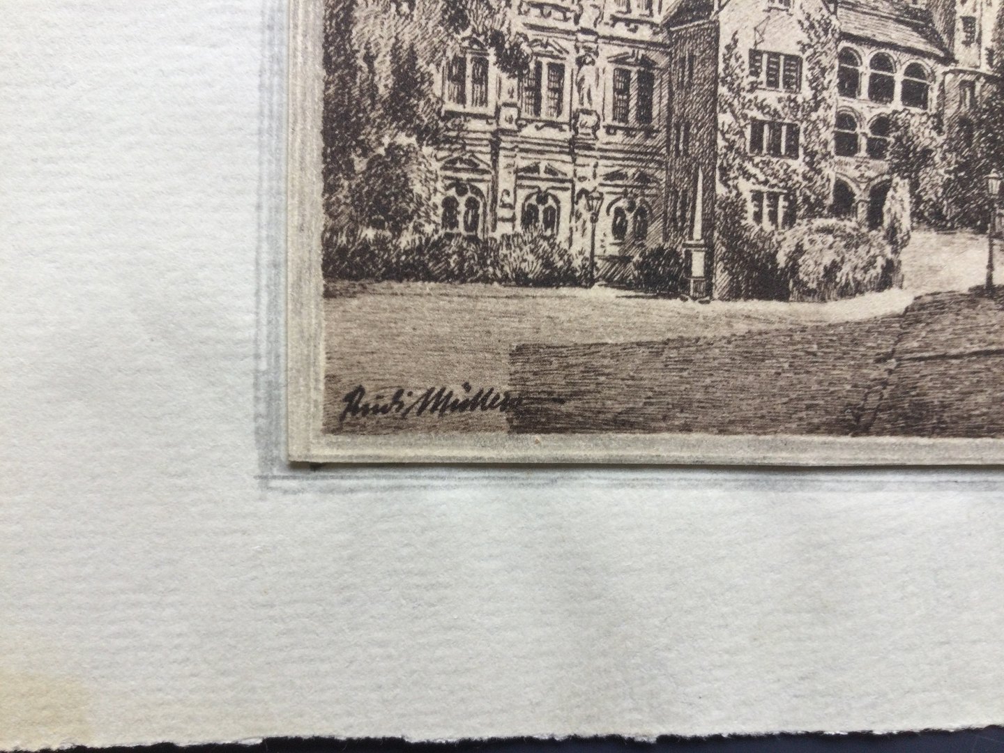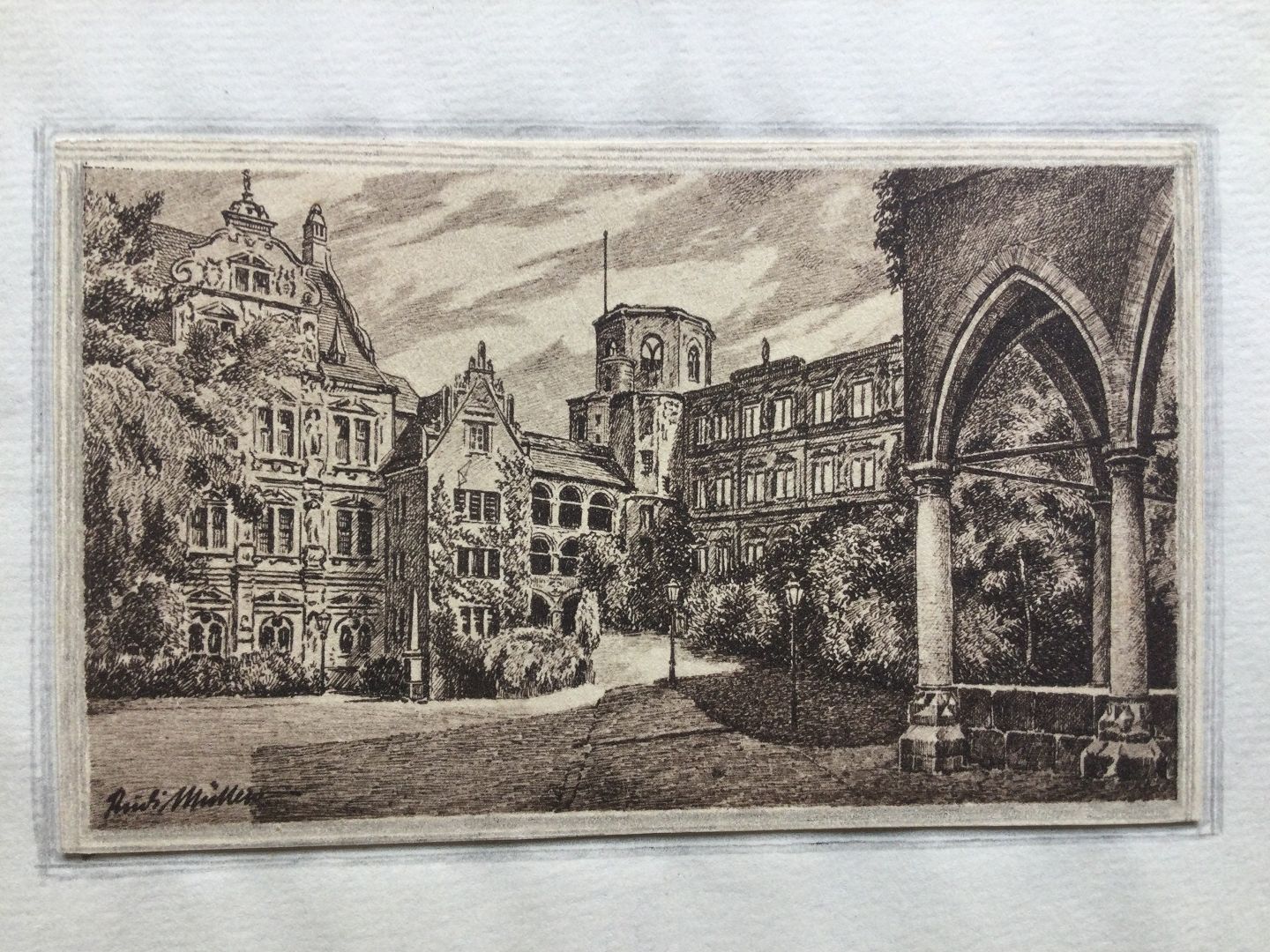 Text available in Danish: Radering af Richard Müller - Slotsgården i Heidelberg.