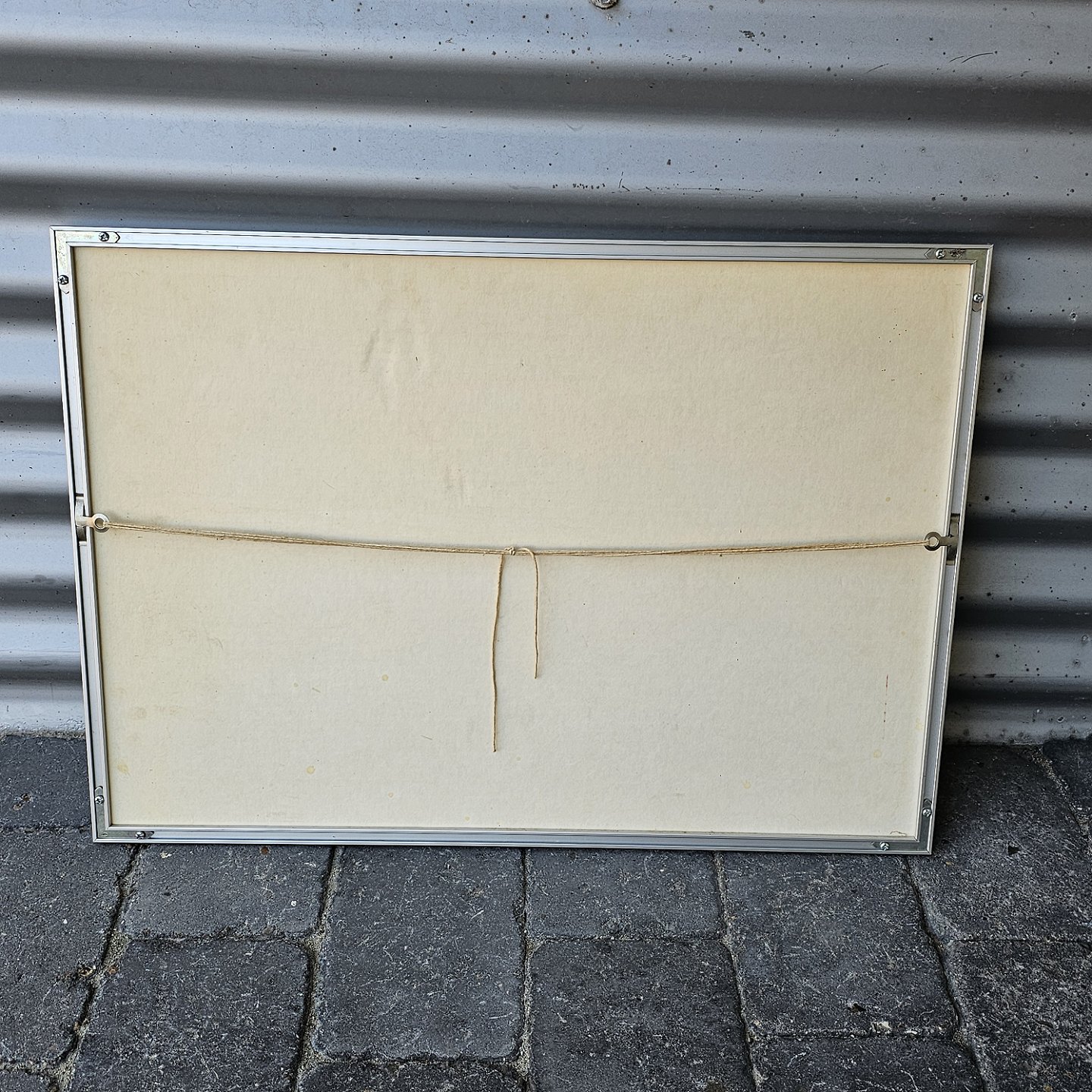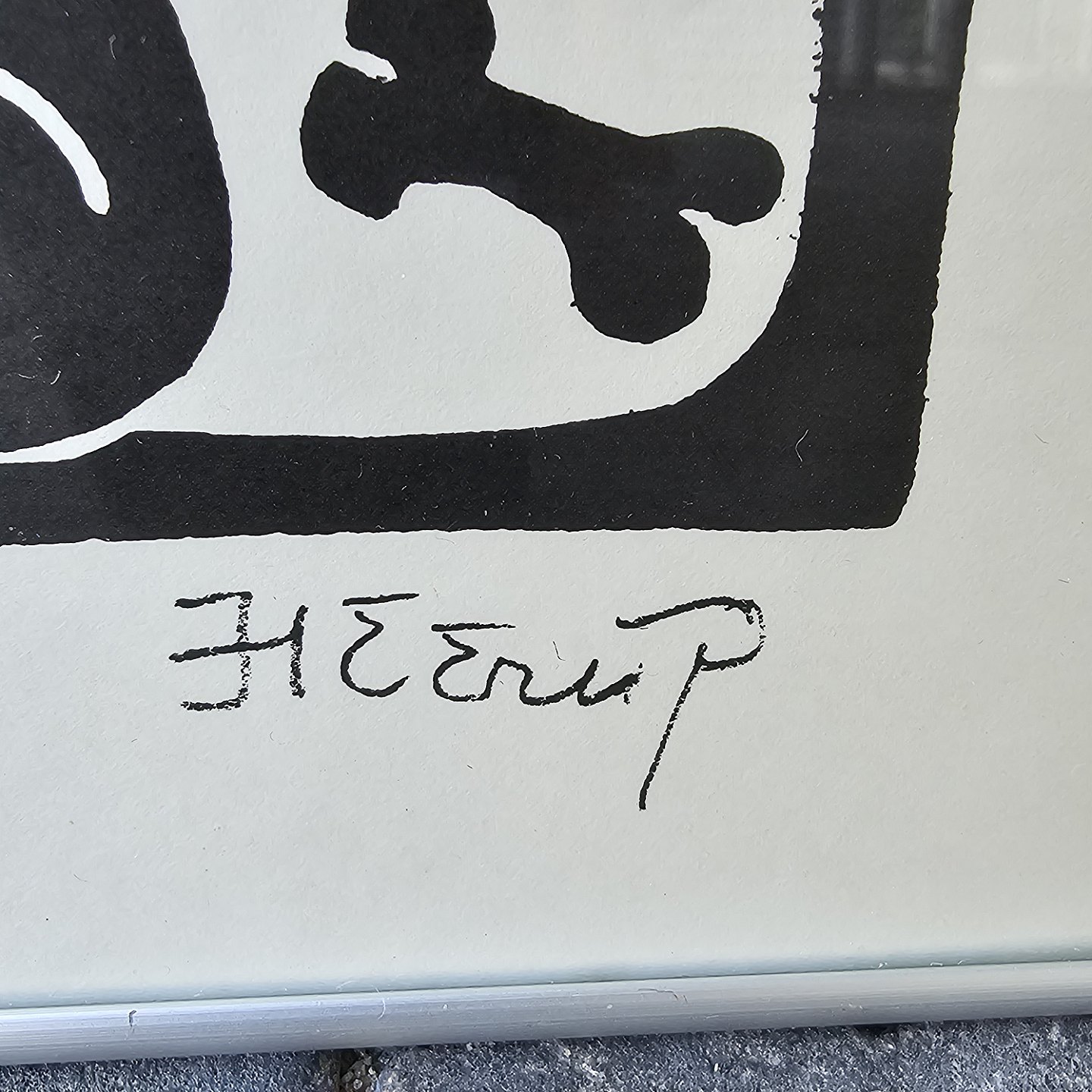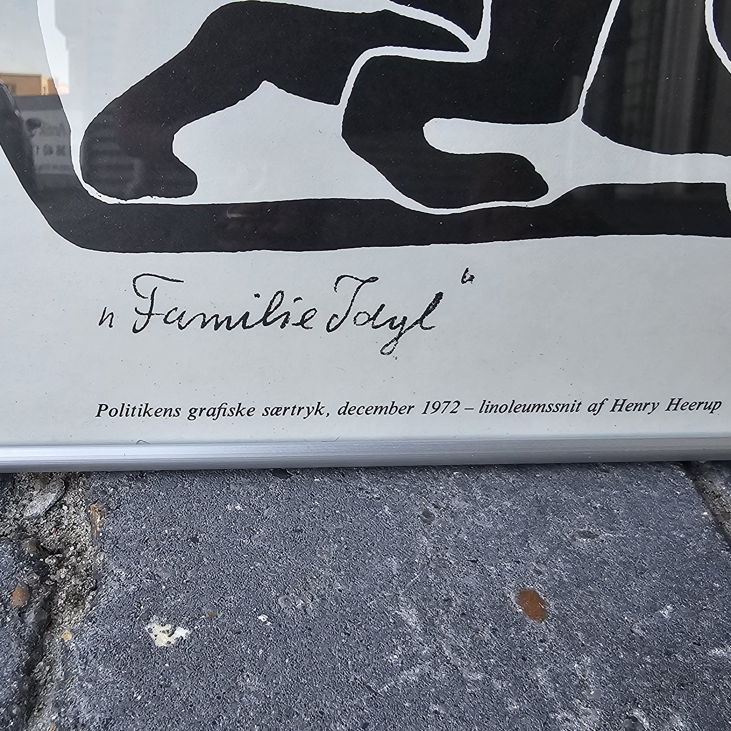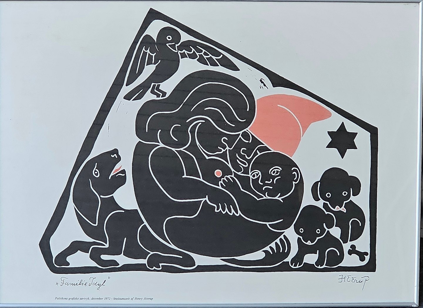 Indrammet litografi i hvid ramme. Grafisk tryk i sort, hvidt og rødt under titlen Familieidyl. Motivet viser mor med barn og hund med hvalpe under en svævende fugl og et rødt hjerte