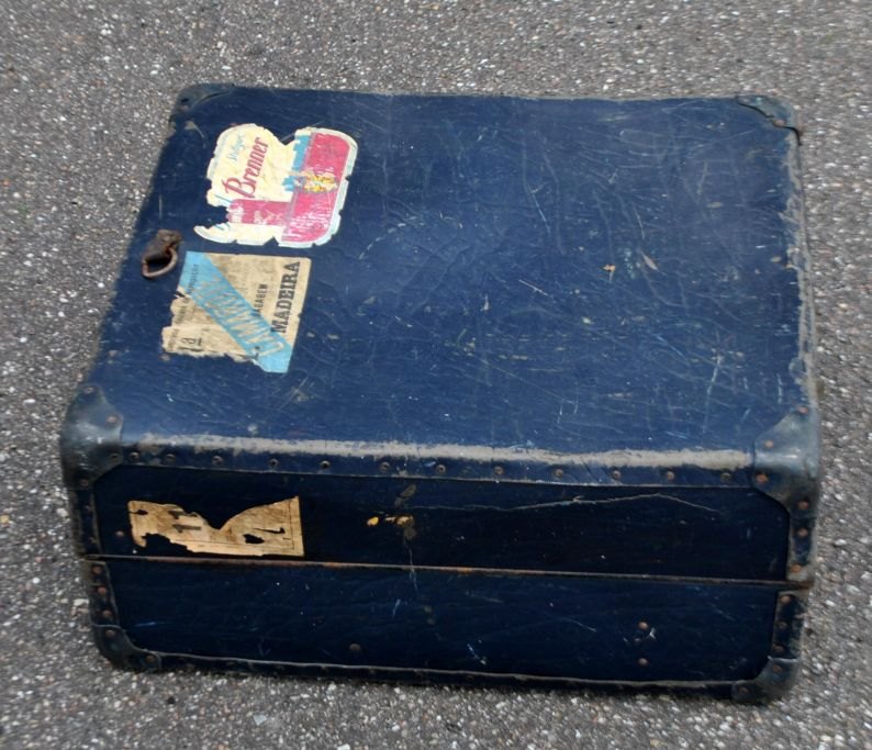 Kuffert, 20. årh. Med tyske mærkater. Bred hank. To låse, rustne og uden nøgle. L: 54 cm. B: 49 cm. H: 26 cm.