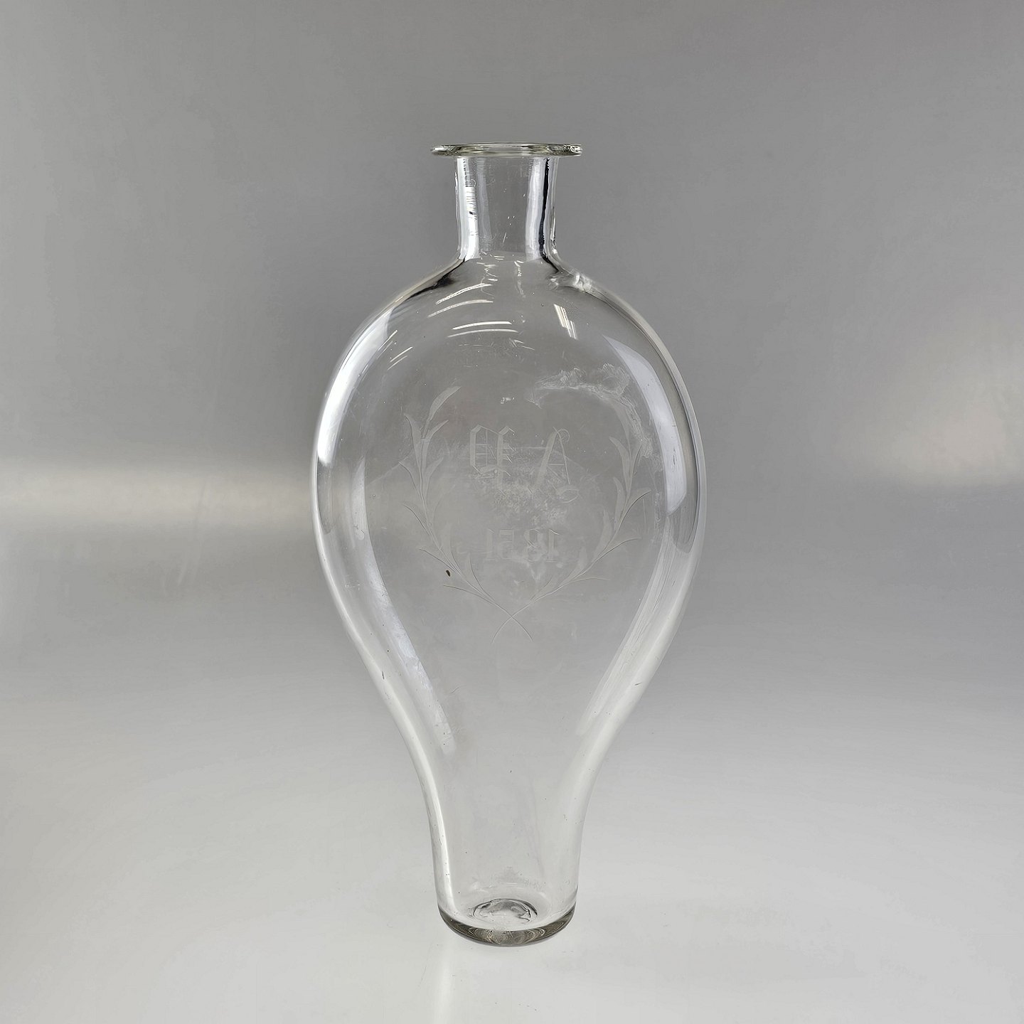 Håndblæst lommelærke i glas med motiv af blade og teksten A.P 1851, har tilhørt en glasarbejder på Aalborg Glasværk