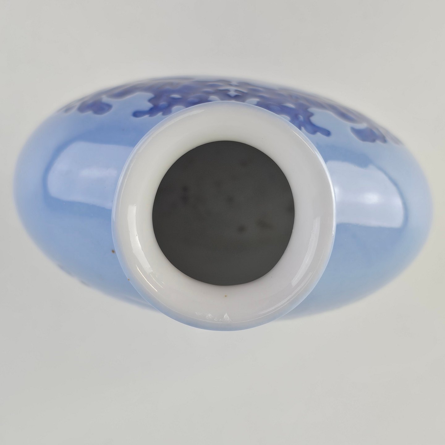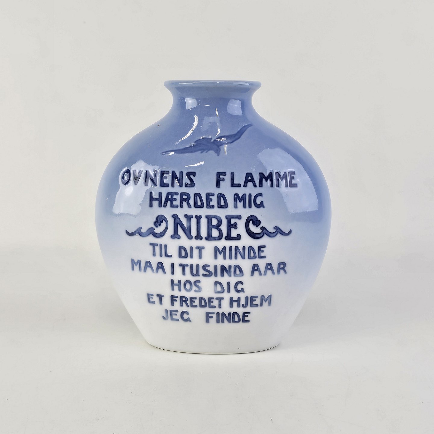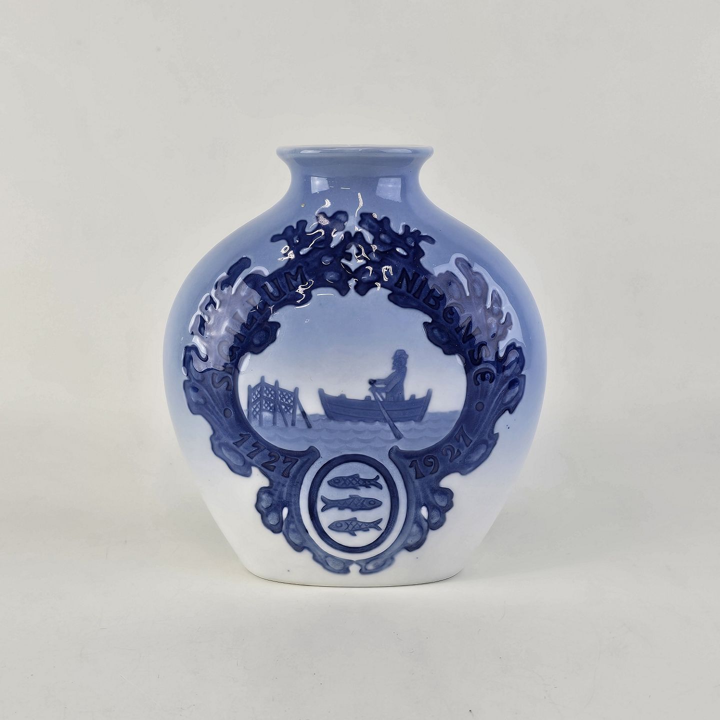 Vase i hvidt porcelæn med motiv i blå nuancer, produceret i anledning af Nibes 200 års jubilæum som købstad