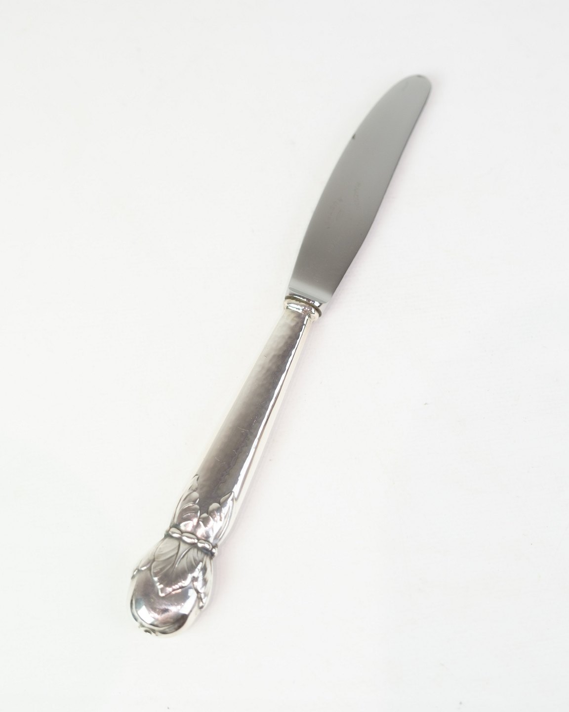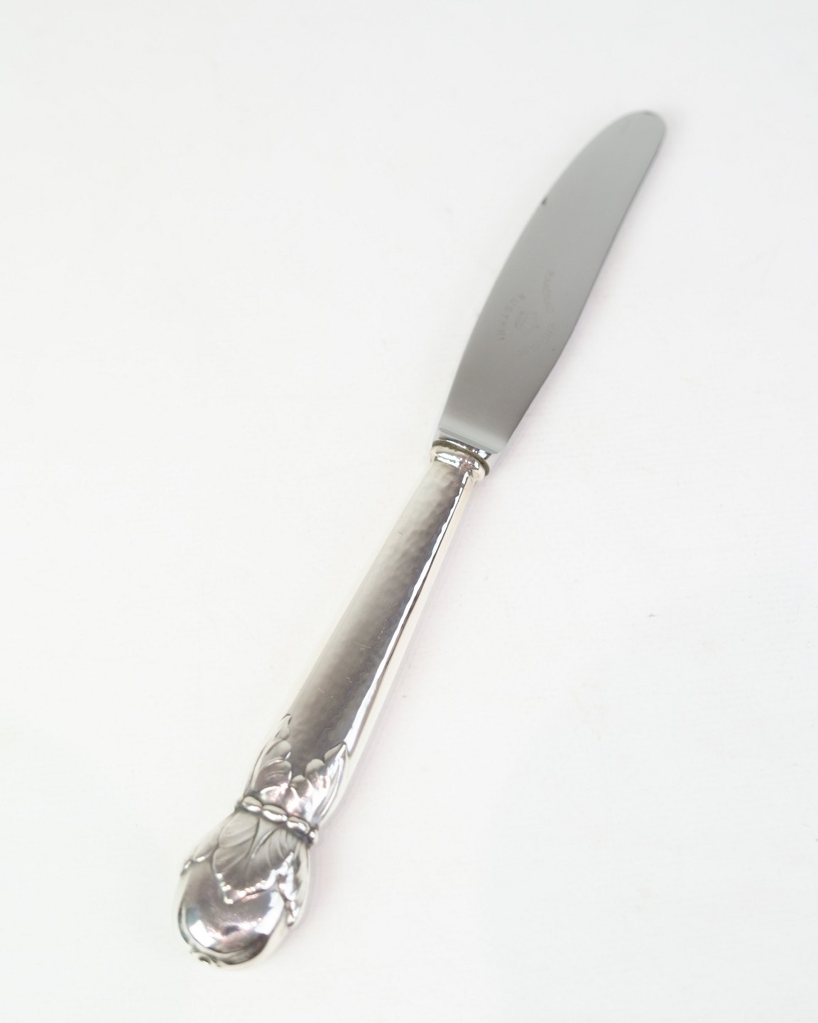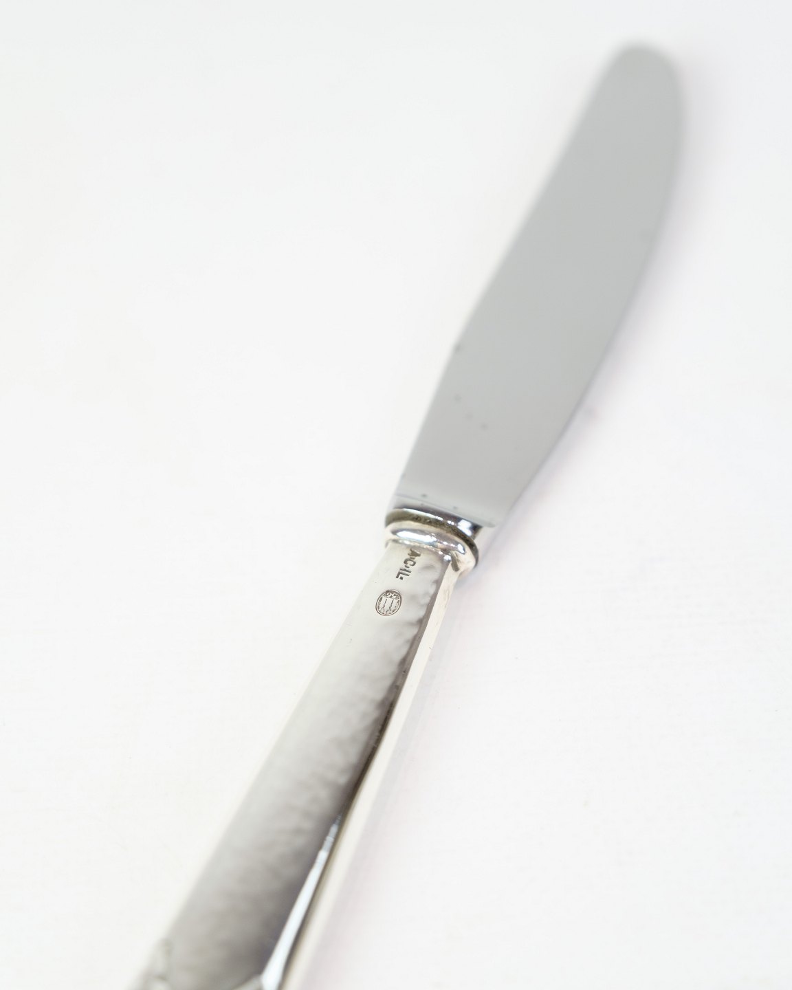 Spisekniv fra A.C. Illum, København. Tretårnet sølv stemplet 825 med stålblad, ca. midt 1900-tallet. Længde 22 cm. Illum var kendt for høj kvalitet.