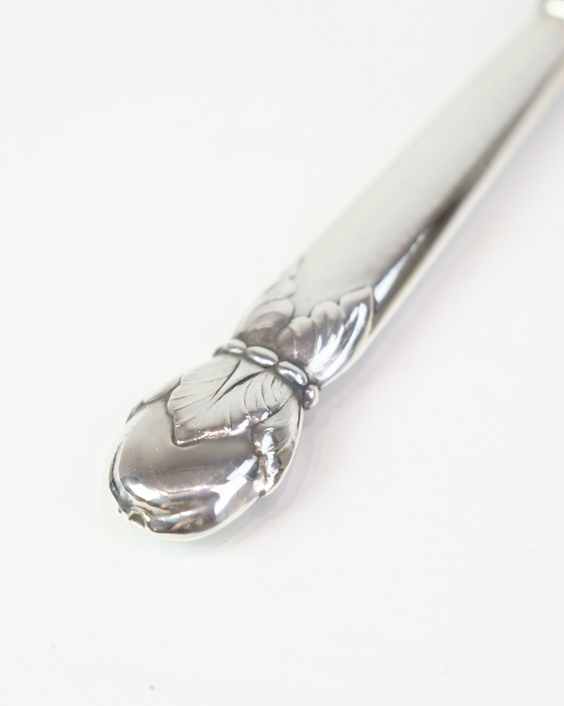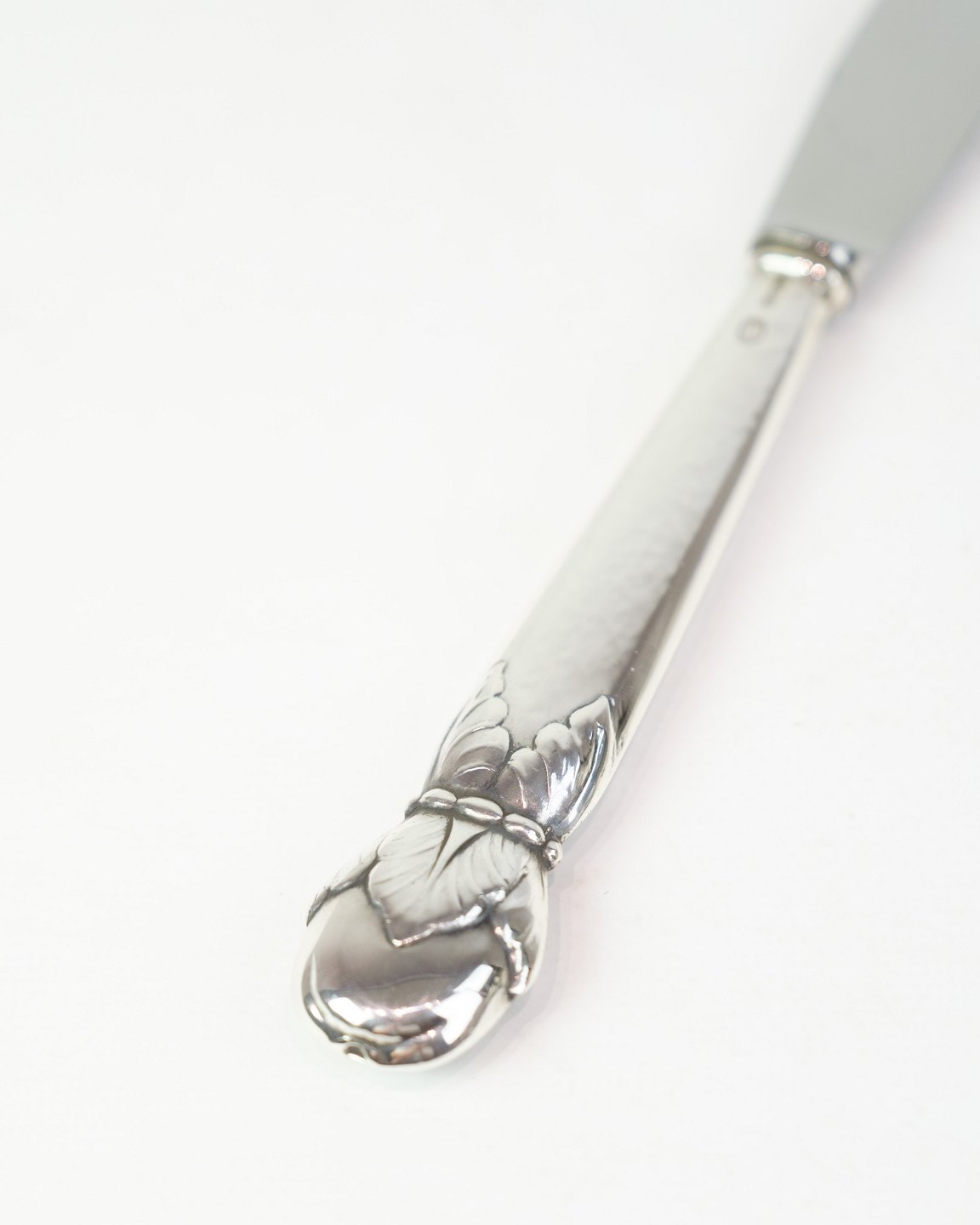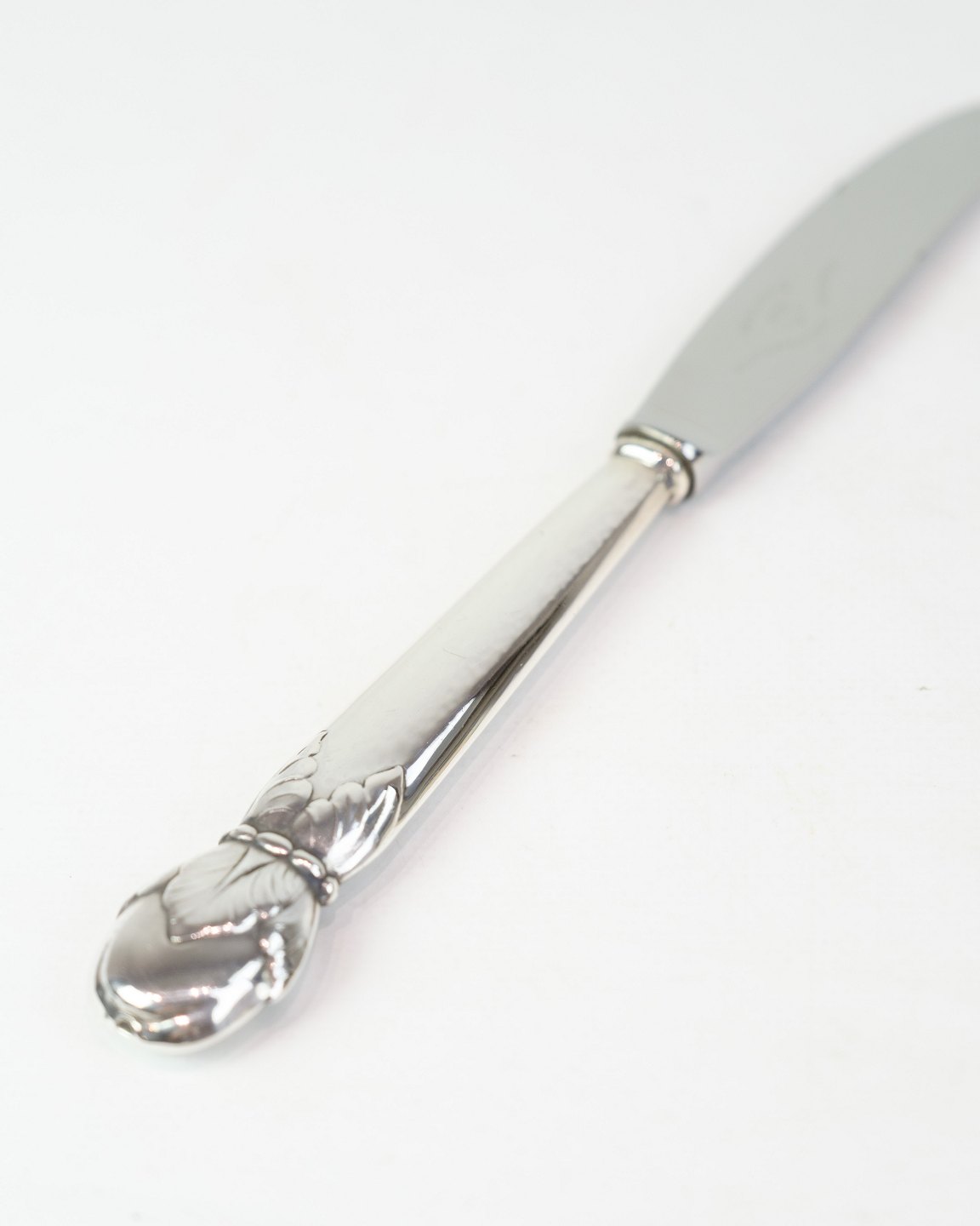 Spisekniv fra A.C. Illum, København. Tretårnet sølv stemplet 825 med stålblad, ca. midt 1900-tallet. Længde 22 cm. Illum var kendt for høj kvalitet.