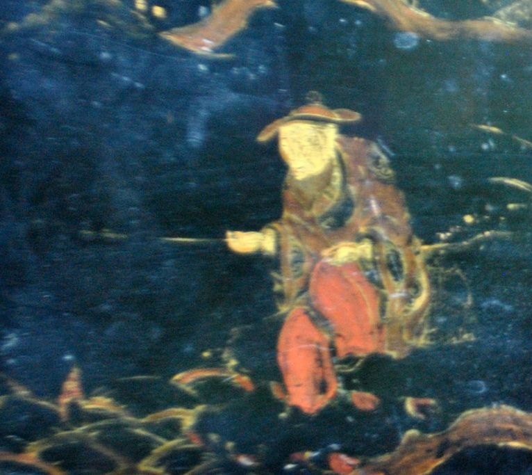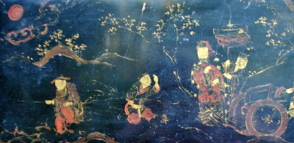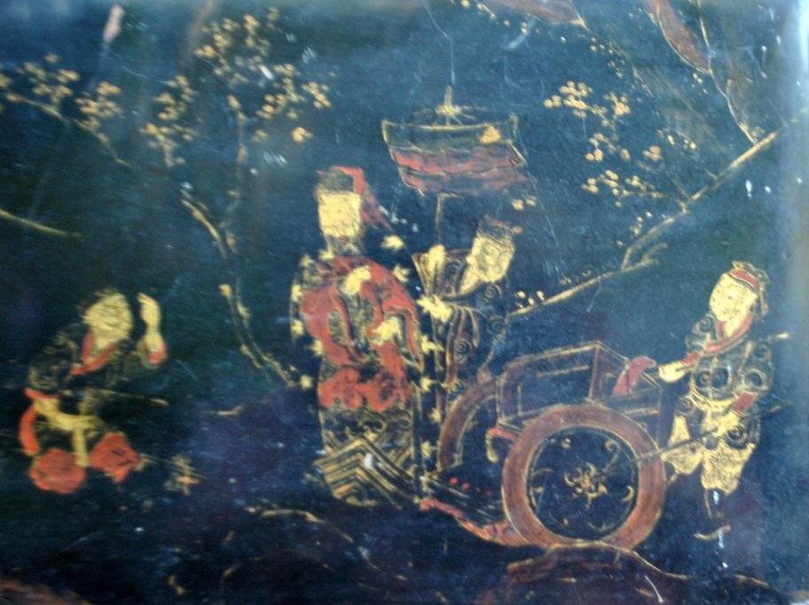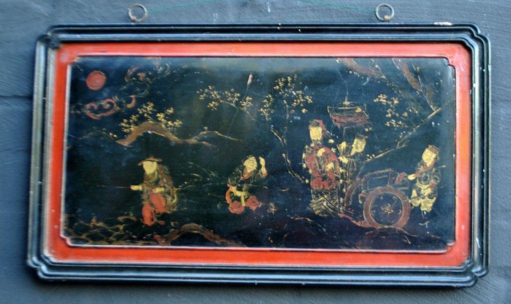 Kinesisk træpanel, 19. årh. Lakeret. Med håndmalet sceneri af fornem mand med kørestol/paraply og hjælpere. Desuden fiskende mænd. Med forgyldninger. Med ramme og ophæng. 32 x 56,5 cm.