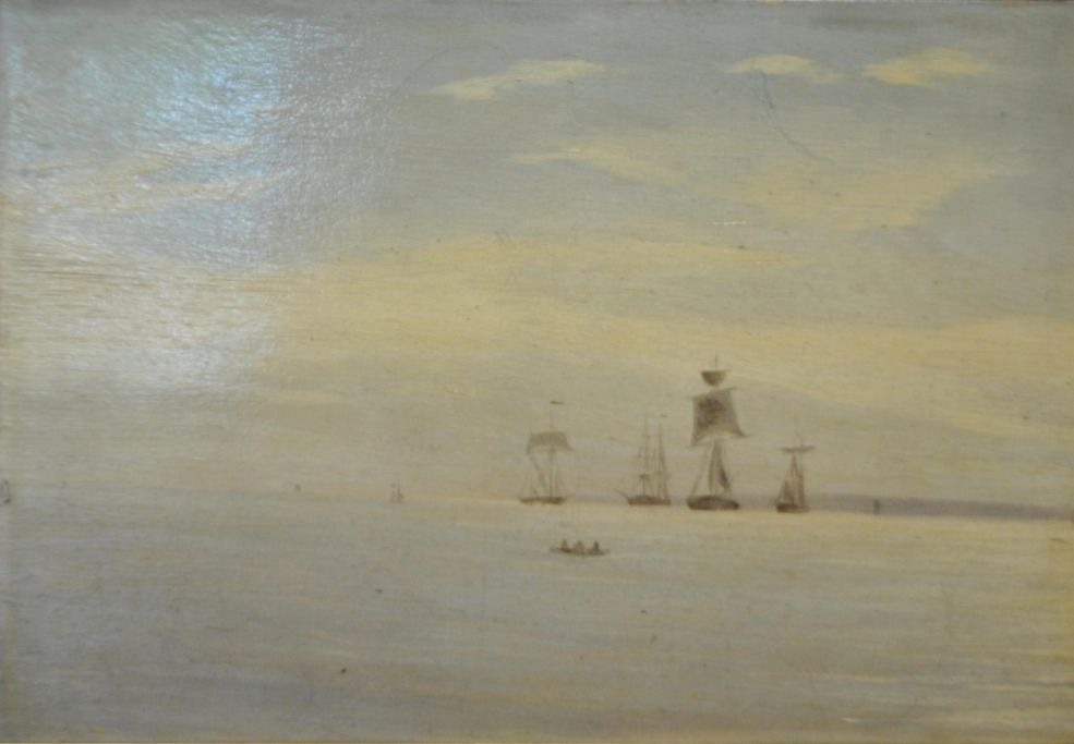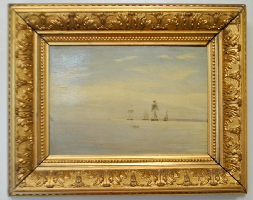 Larsen, Emanuel (1823 - 1859) Danmark: Marine med talrige sejlskibe. Olie på pap. Udsigneret. 15 x 20,5 cm.