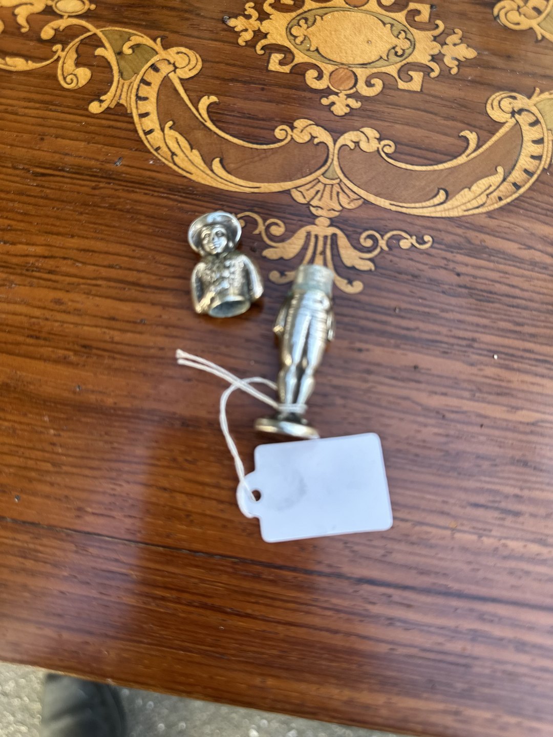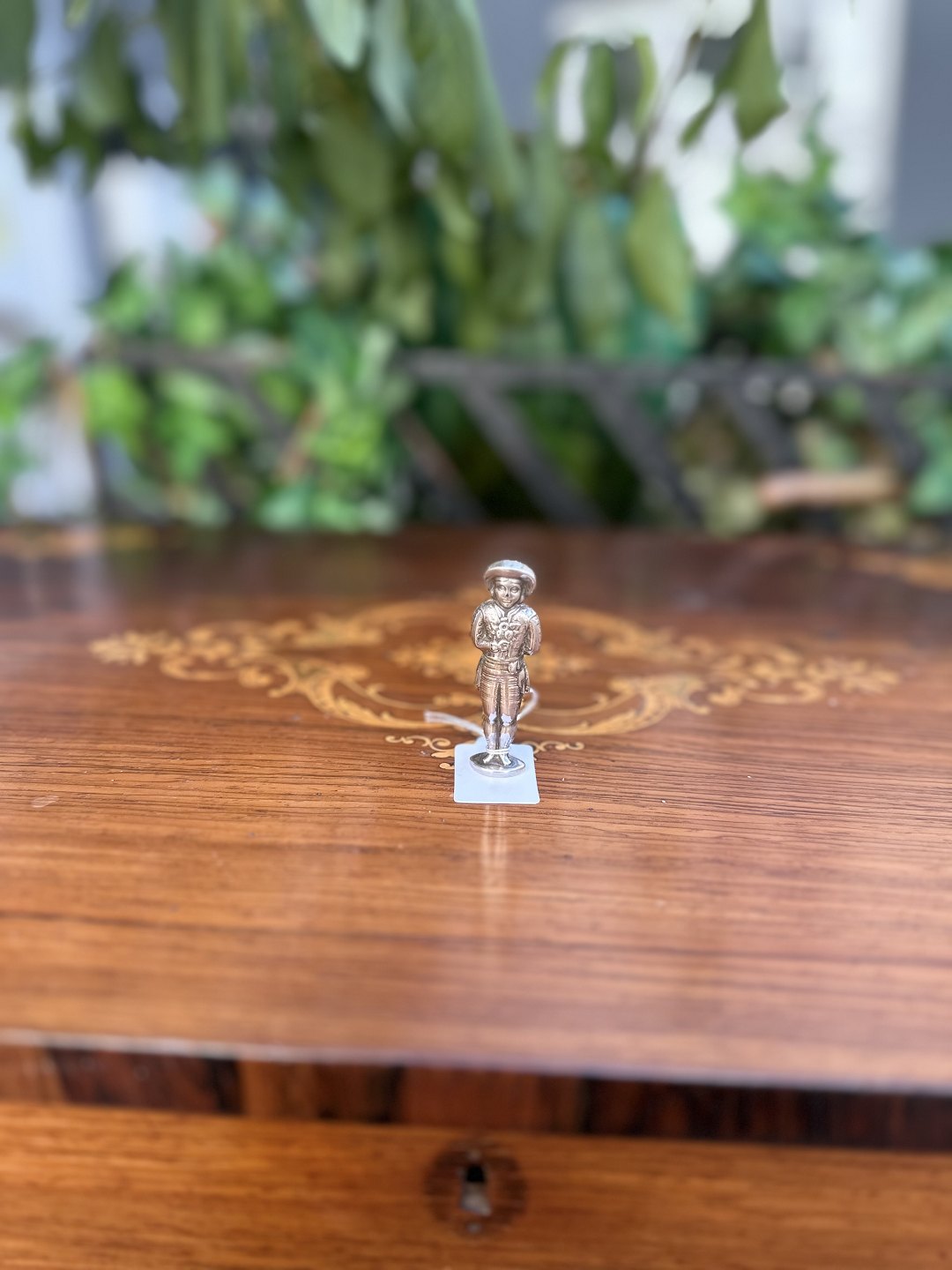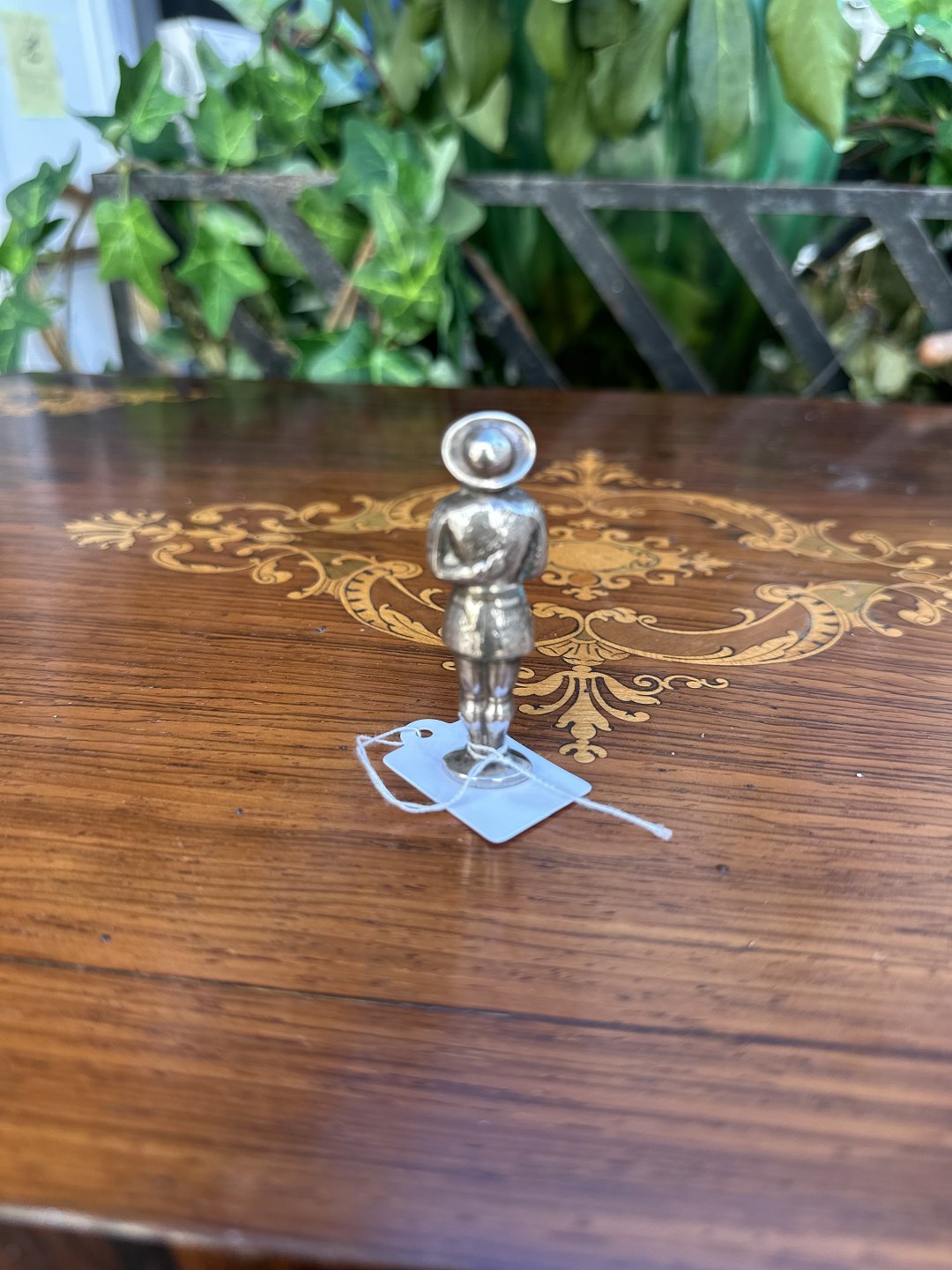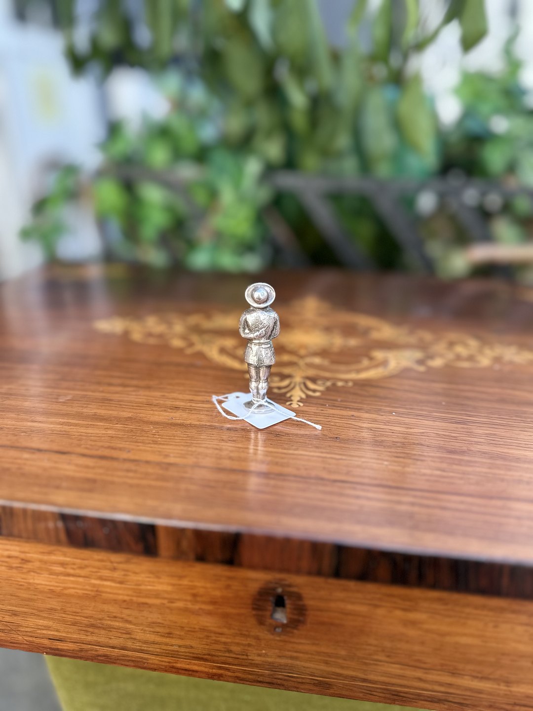 Vintage nålebeholder i sølv , formen en lille figur ( mand i folkedragt , fra 1800 tallet