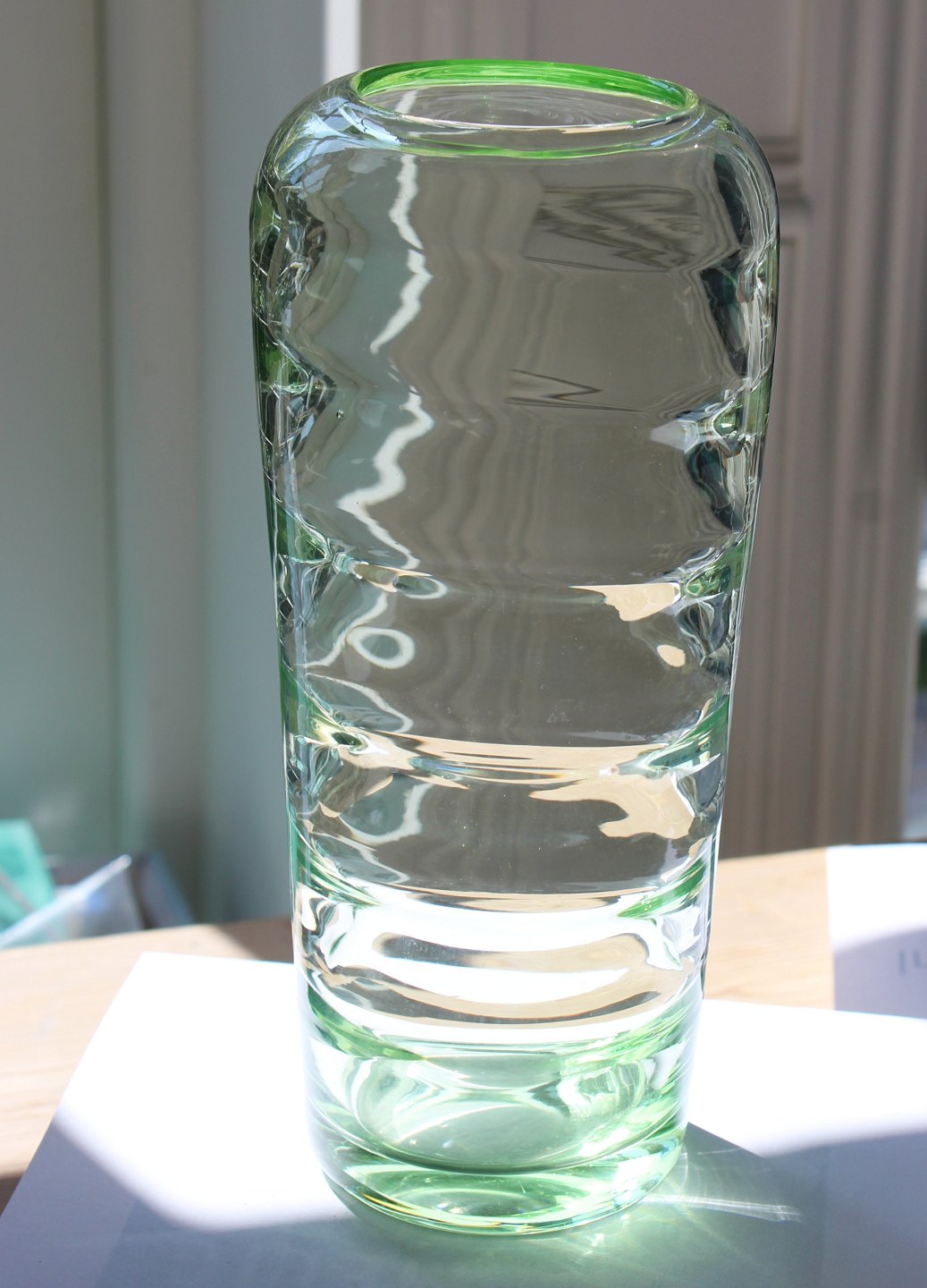 Antagelig Holmegaard, Neongrøn transparent vase med riller. Højde 25 cm. Diameter 11,5 cm. Rundslebet i bund. Flot stand med enkelte luftbobler og få brugsspor. Pris: 475 kr.