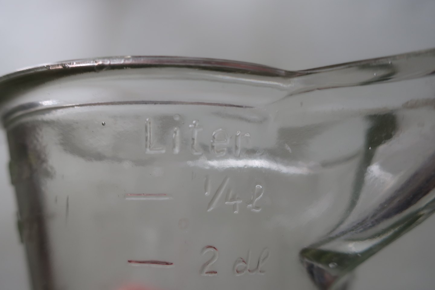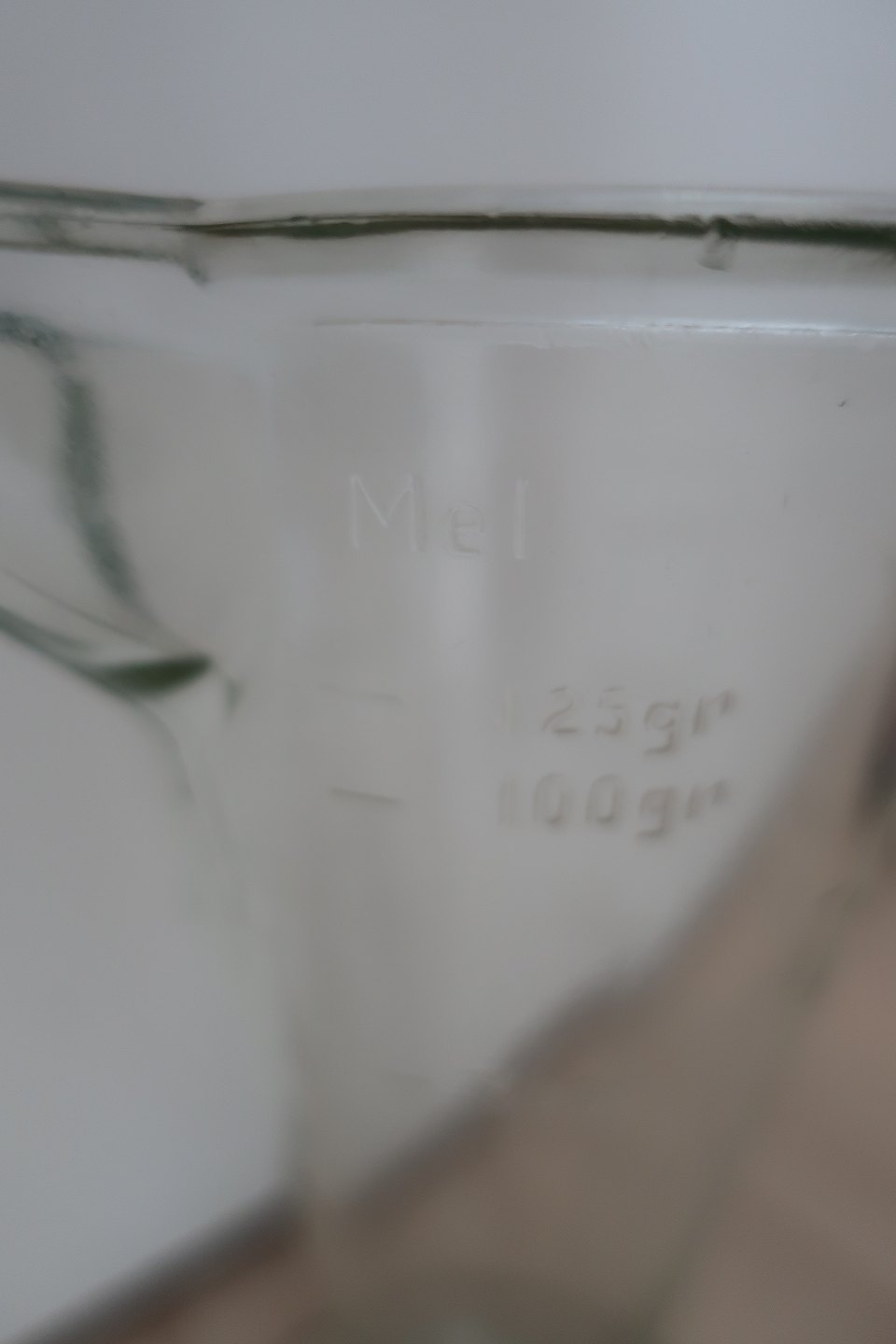 Mængde-/vægt-angivelse i gram, liter, deciliter for f.eks. sukker, ris, mel, havregryn, f.eks. 250 gram eller 75 gram