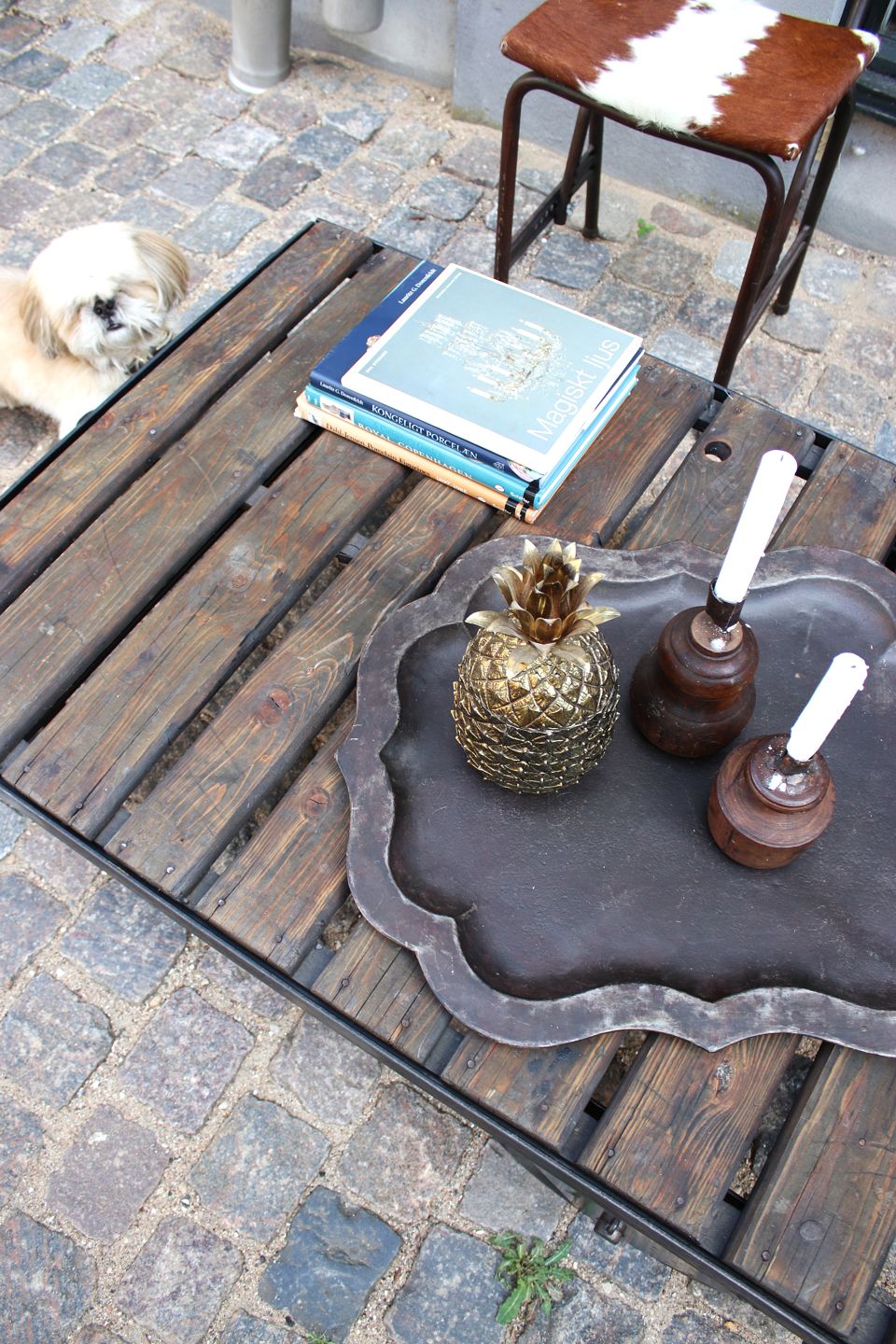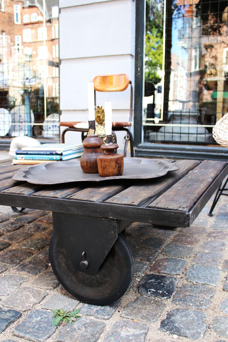 Gammelt fransk industrielt sofabord , en gammel industri pallevogn i jern på hjul og trælameller på toppen.