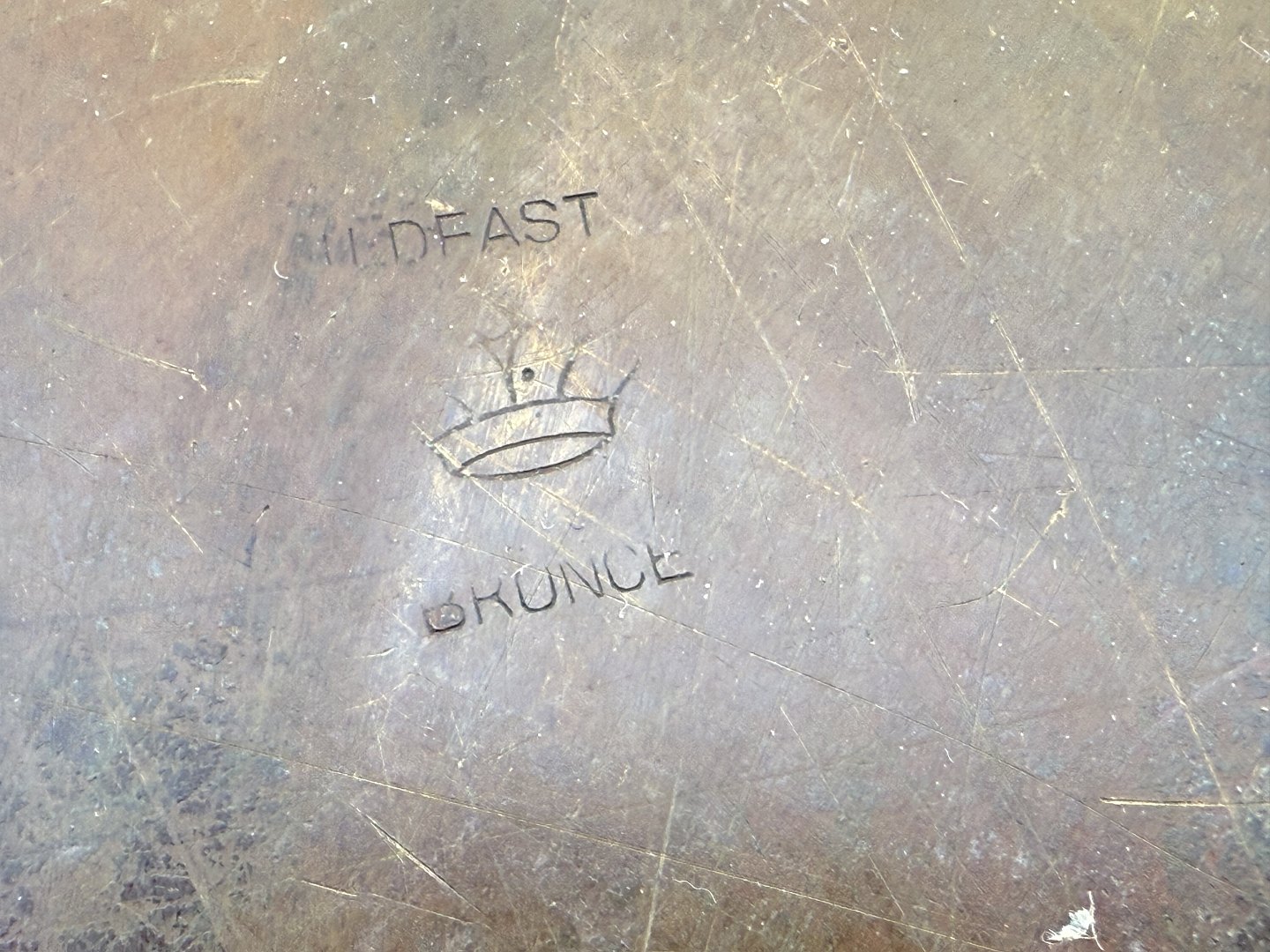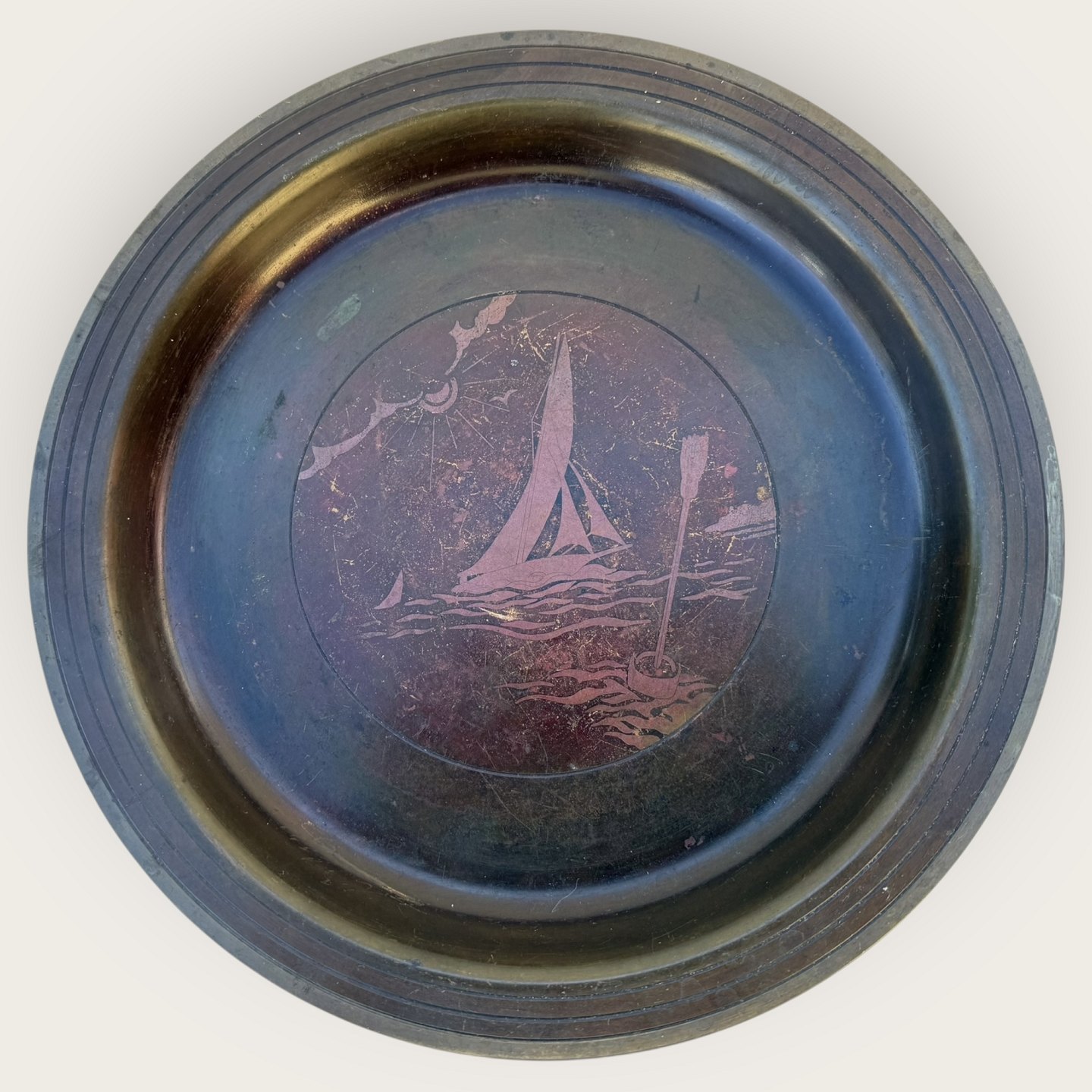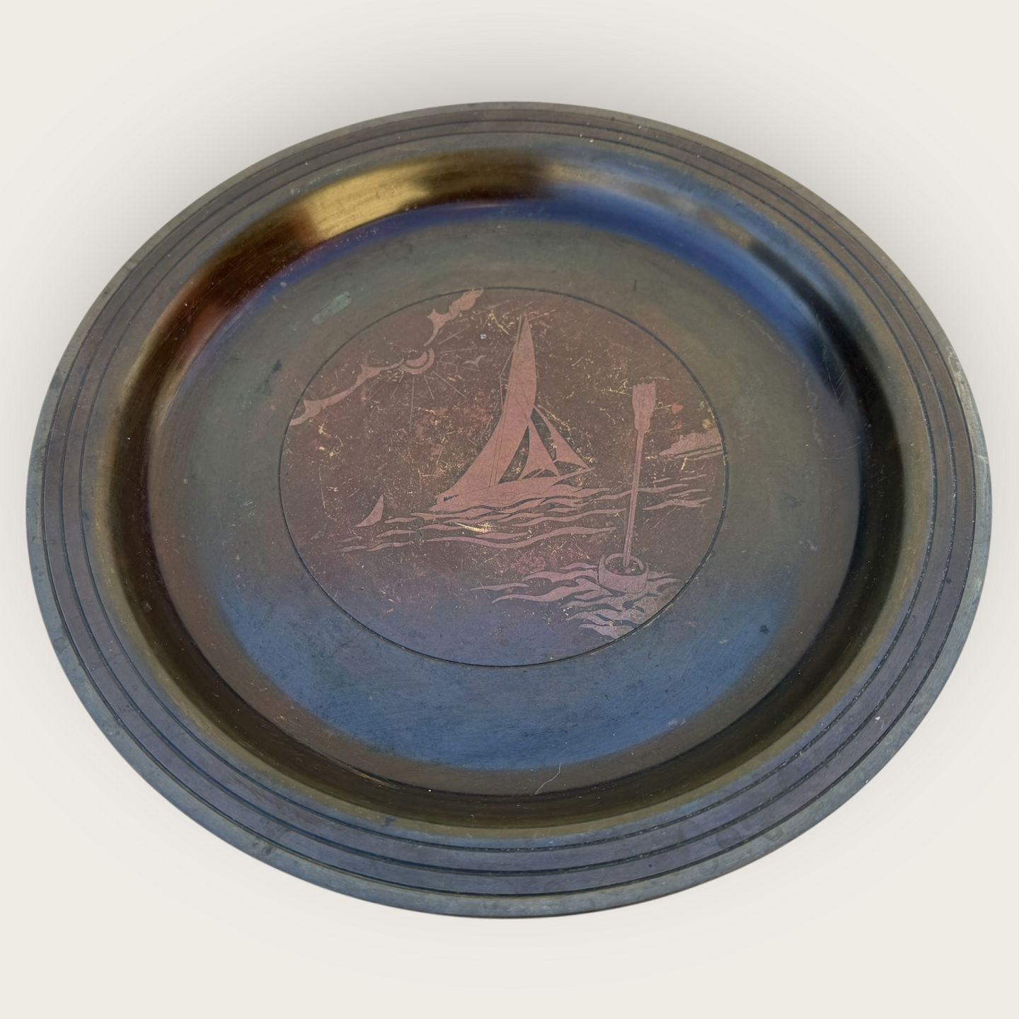 Bronze fad med skibsmotiv, Mærket: Ildfast Bronce, Diameter 32,5cm, Pæn patineret stand