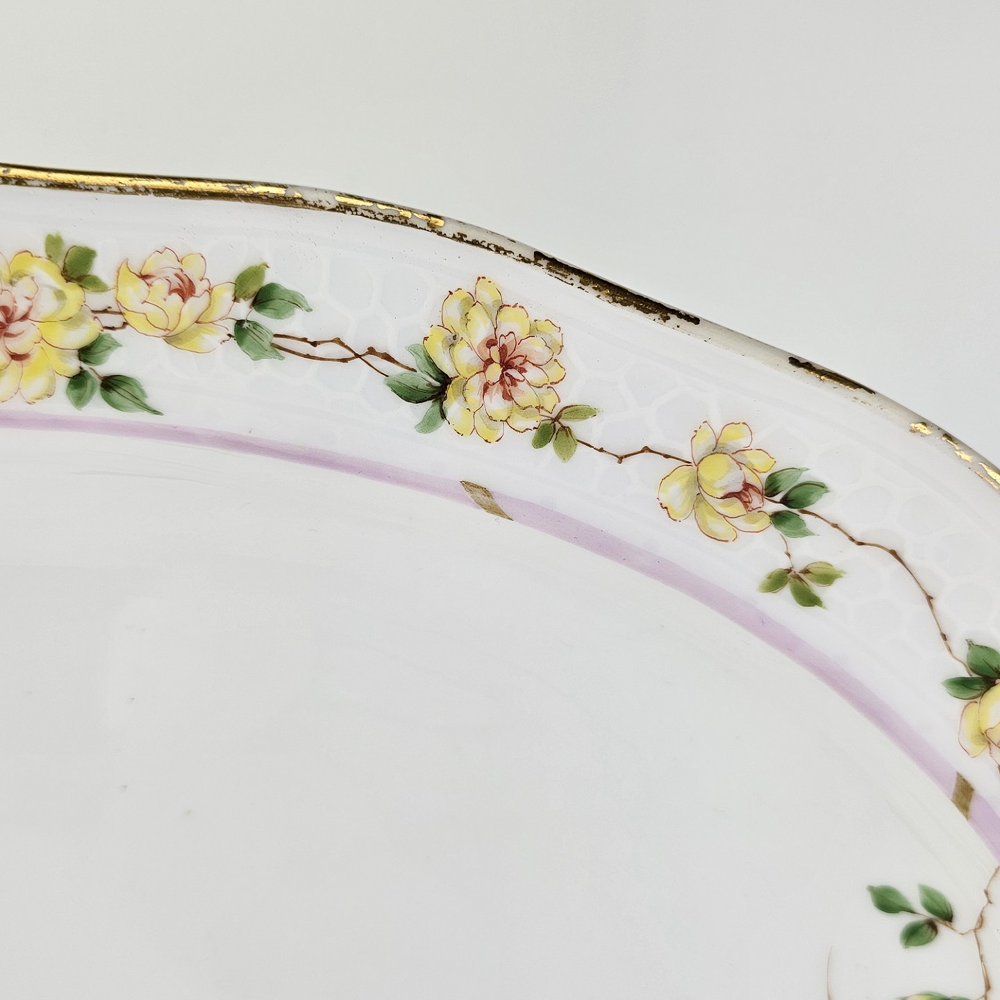 Service i hvidt porcelæn med hamret kantmønster dekoreret med gule blomsterranker og lyslilla streg. Stellet er med guldkant og det er mærket med bølger anvendt frem til 1890.