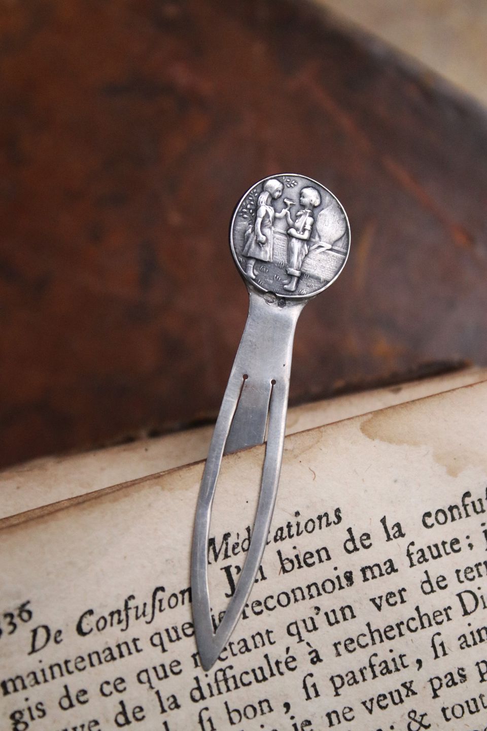 Gammelt bogmærke i sølv (stemplet) Længde 6cm. med motiv af lille dreng & pige.