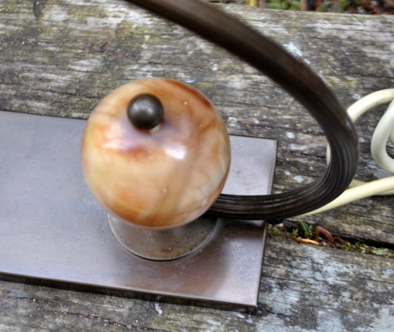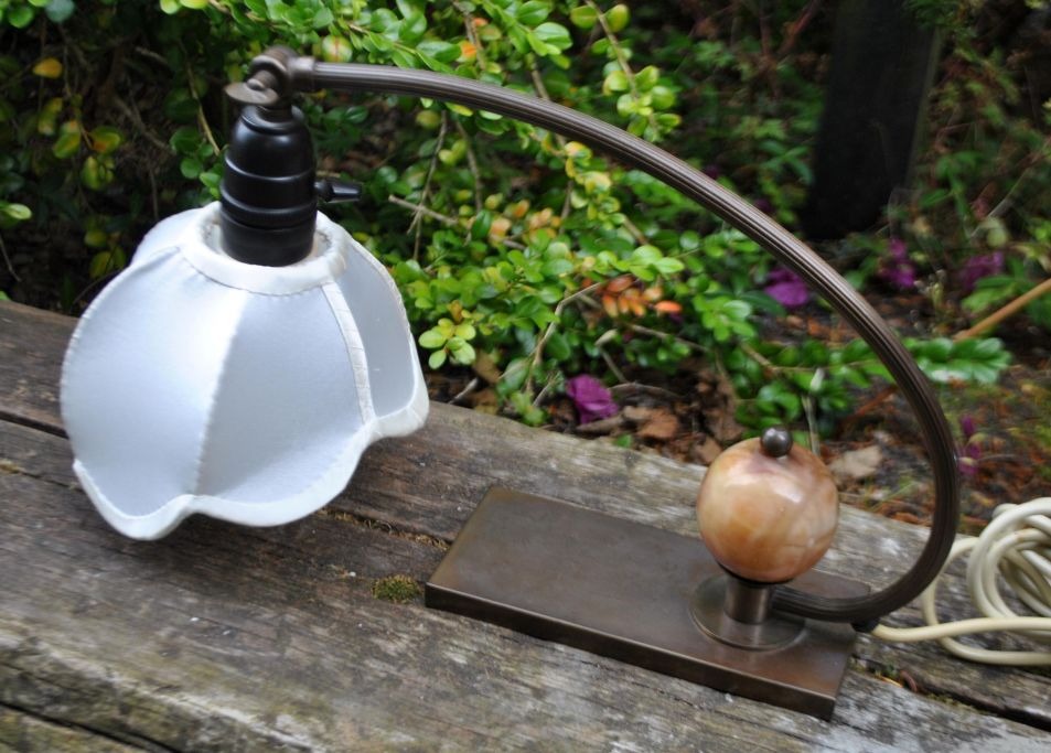 Dansk art deco klaverlampe, ca. 1930. Af mærket Ruko. Messing og kugle i alabast. Lysarm med fatning/skærm. H.: 22,5 cm. L.: 37 cm.