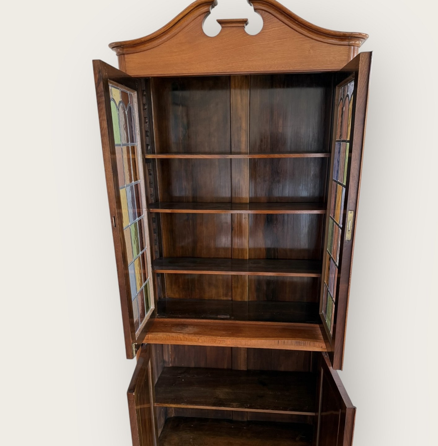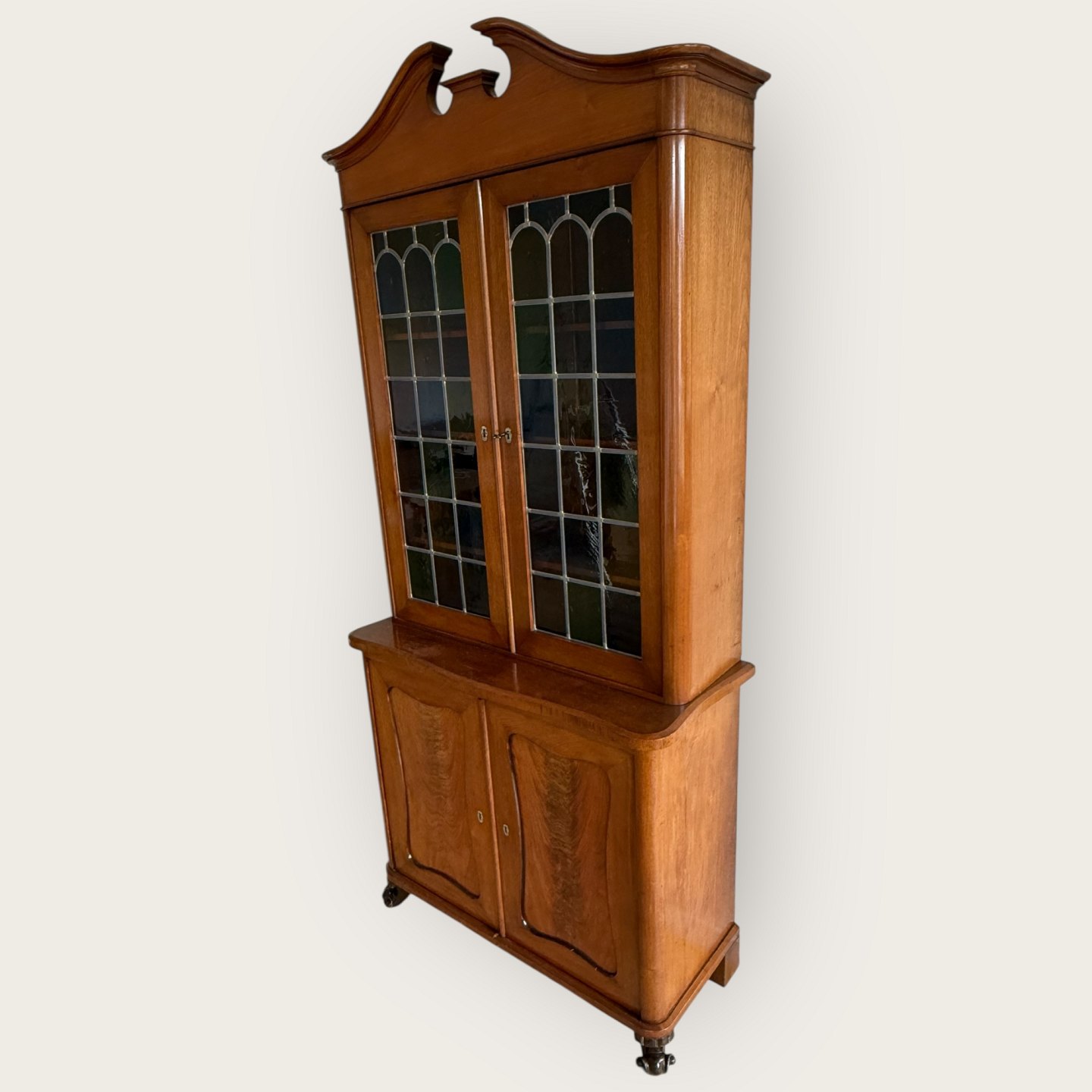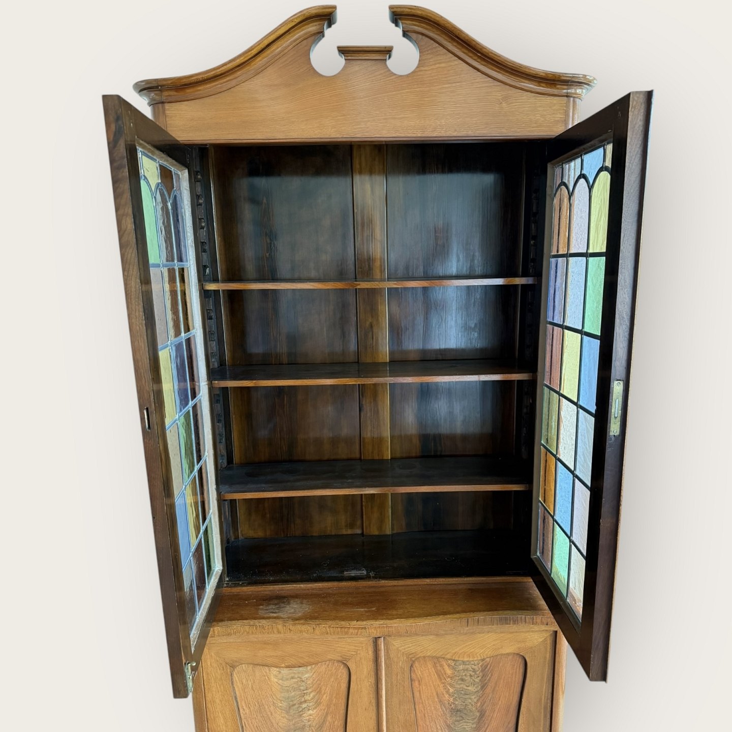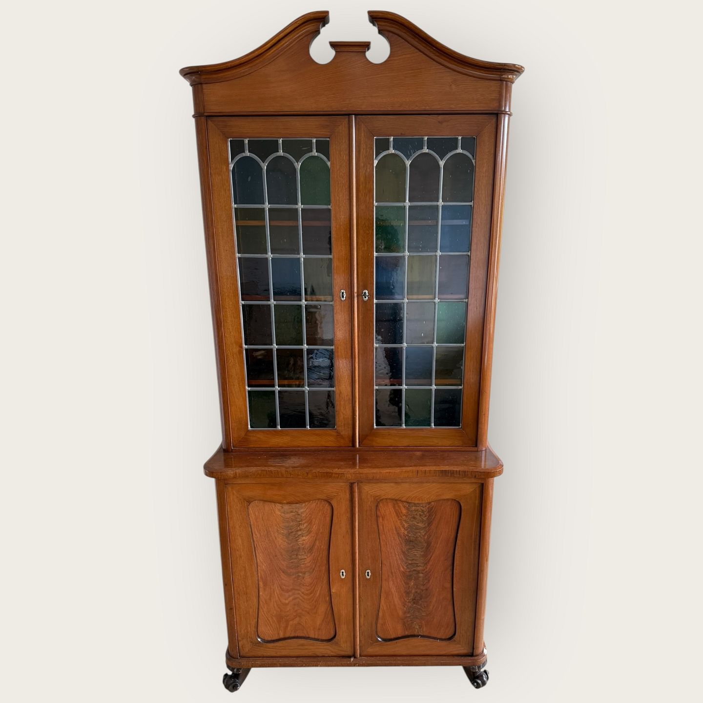 Dækketøjs skab i mahognifiner, overdel med farvede blyindfattede glas samt lys, Fremstår i fin brugt stand, Mål: HxBxD 198x90x39cm