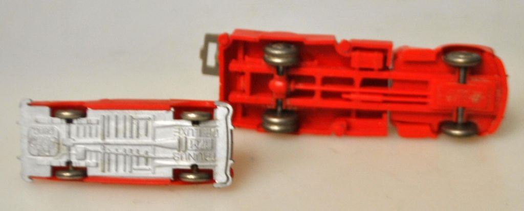 To ældre Lego biler, 20. årh. Plastic med metalhjul. Brandbil med stige og Taunus De Luxe, 17 M. L.: 5 - 8 cm.