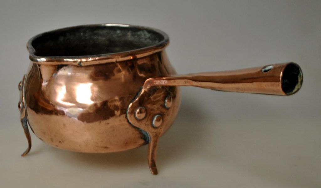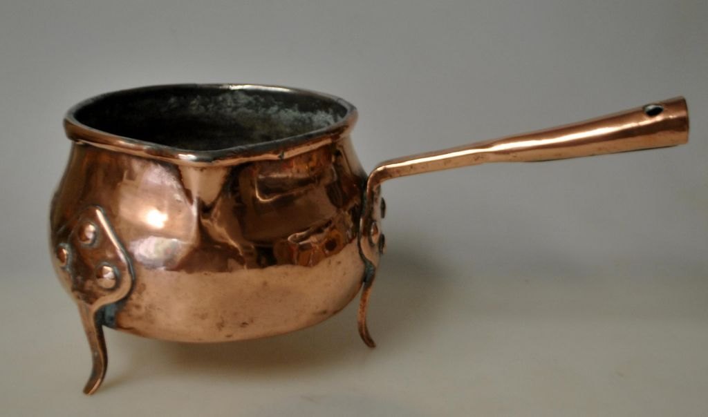 Stjært potte i kobber, ca. 1840, Danmark. Ustemplet. På tre ben og med hank. H.: 11 cm. L.: 24 cm. Dia: 12 cm.