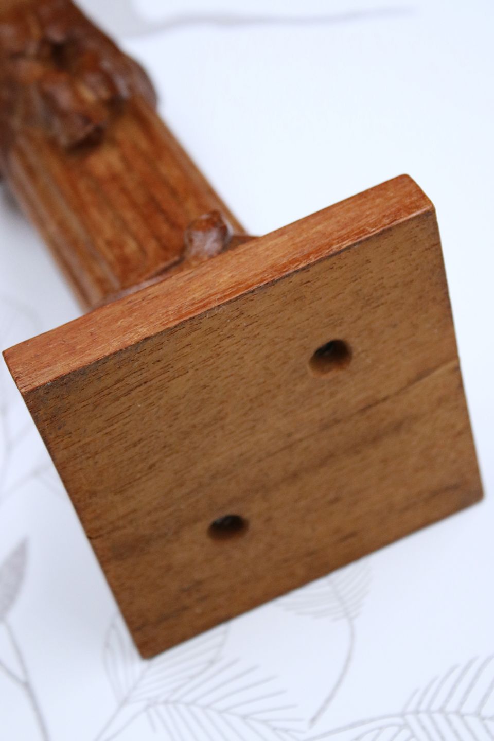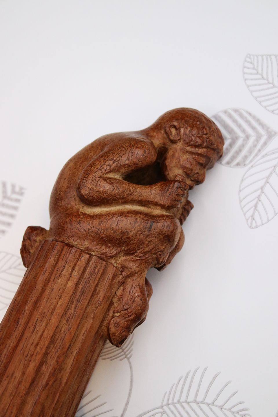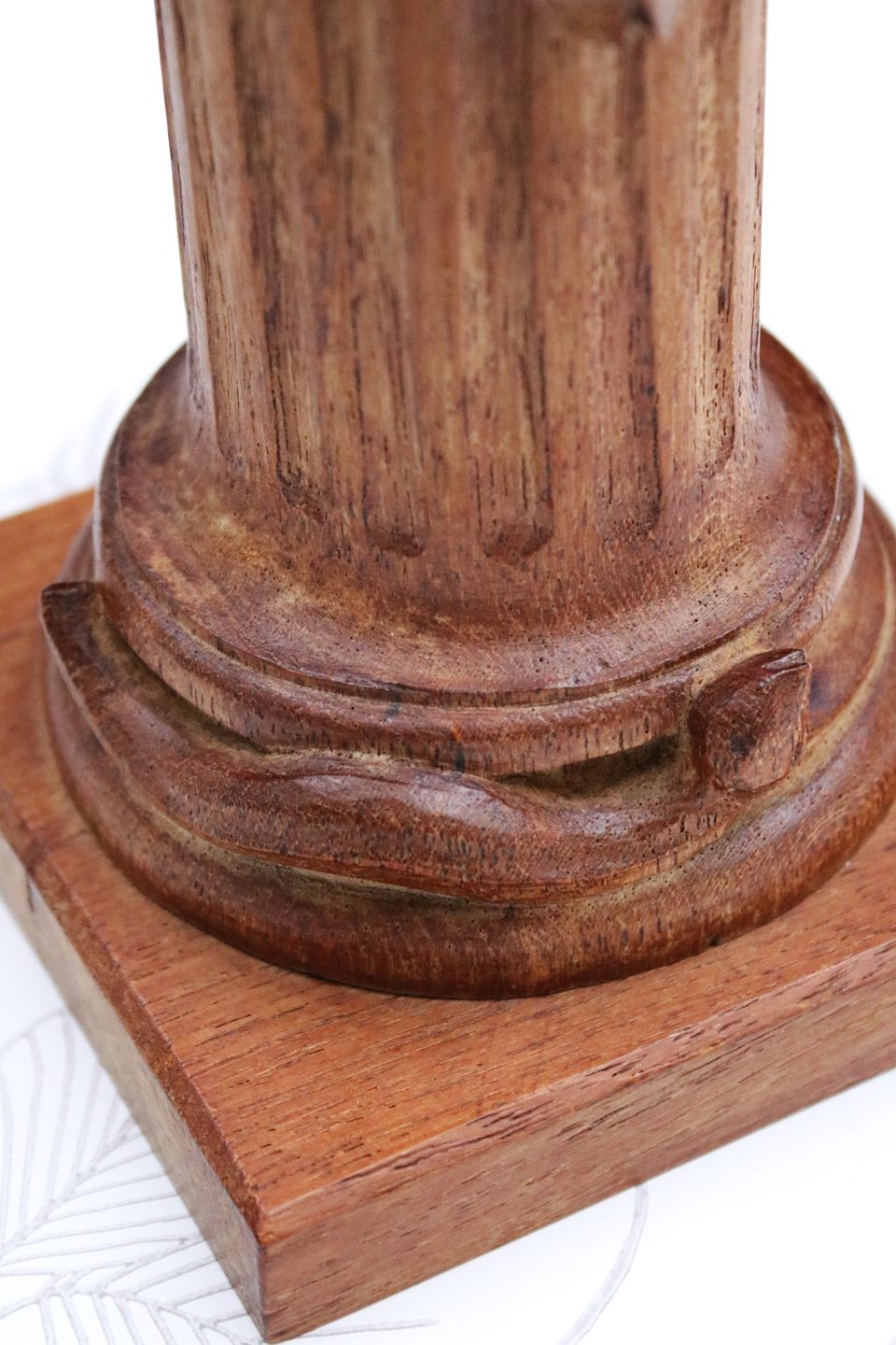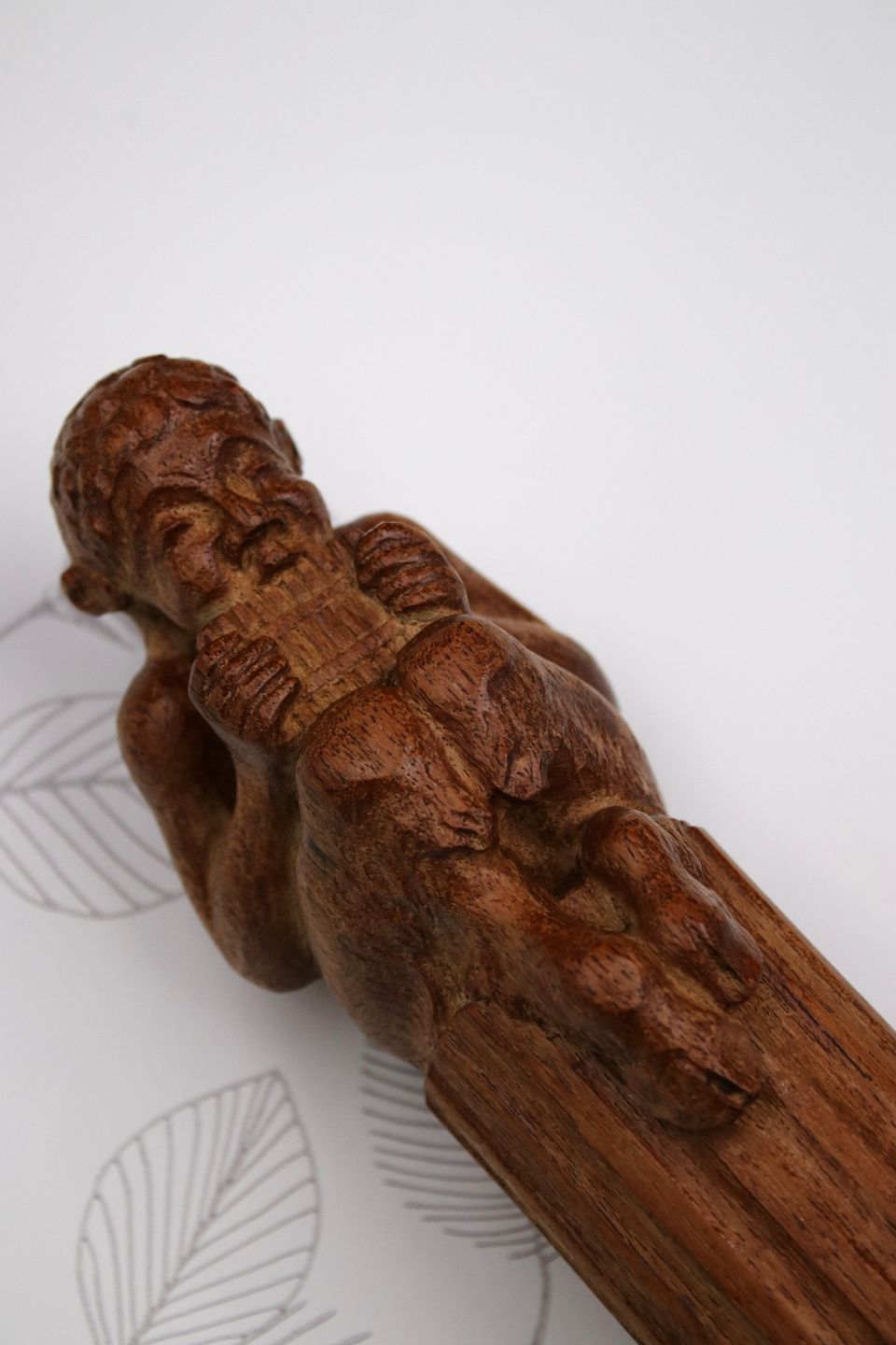 Dekorativ , gammel Pan figur siddende på søjle udskåret i træ.