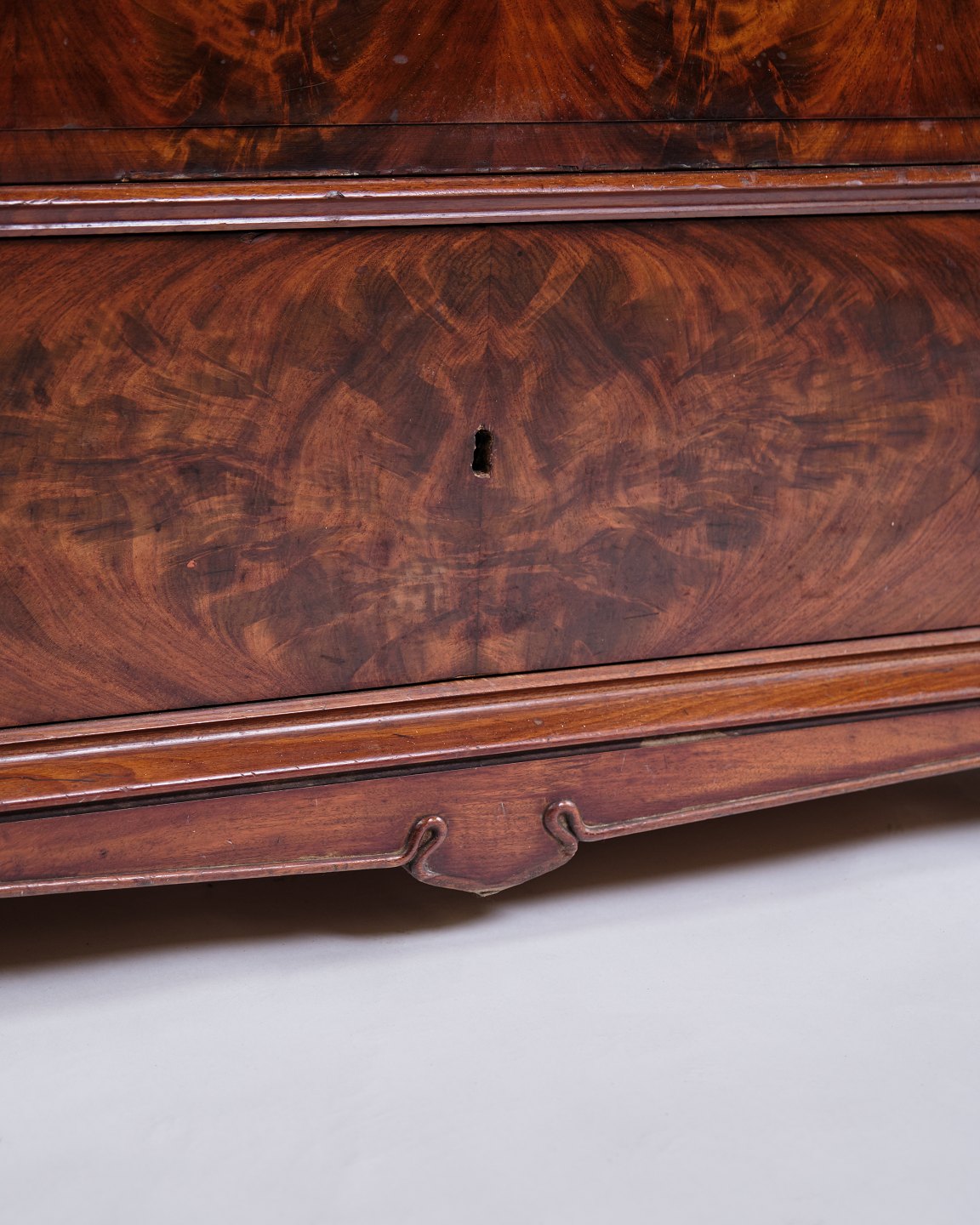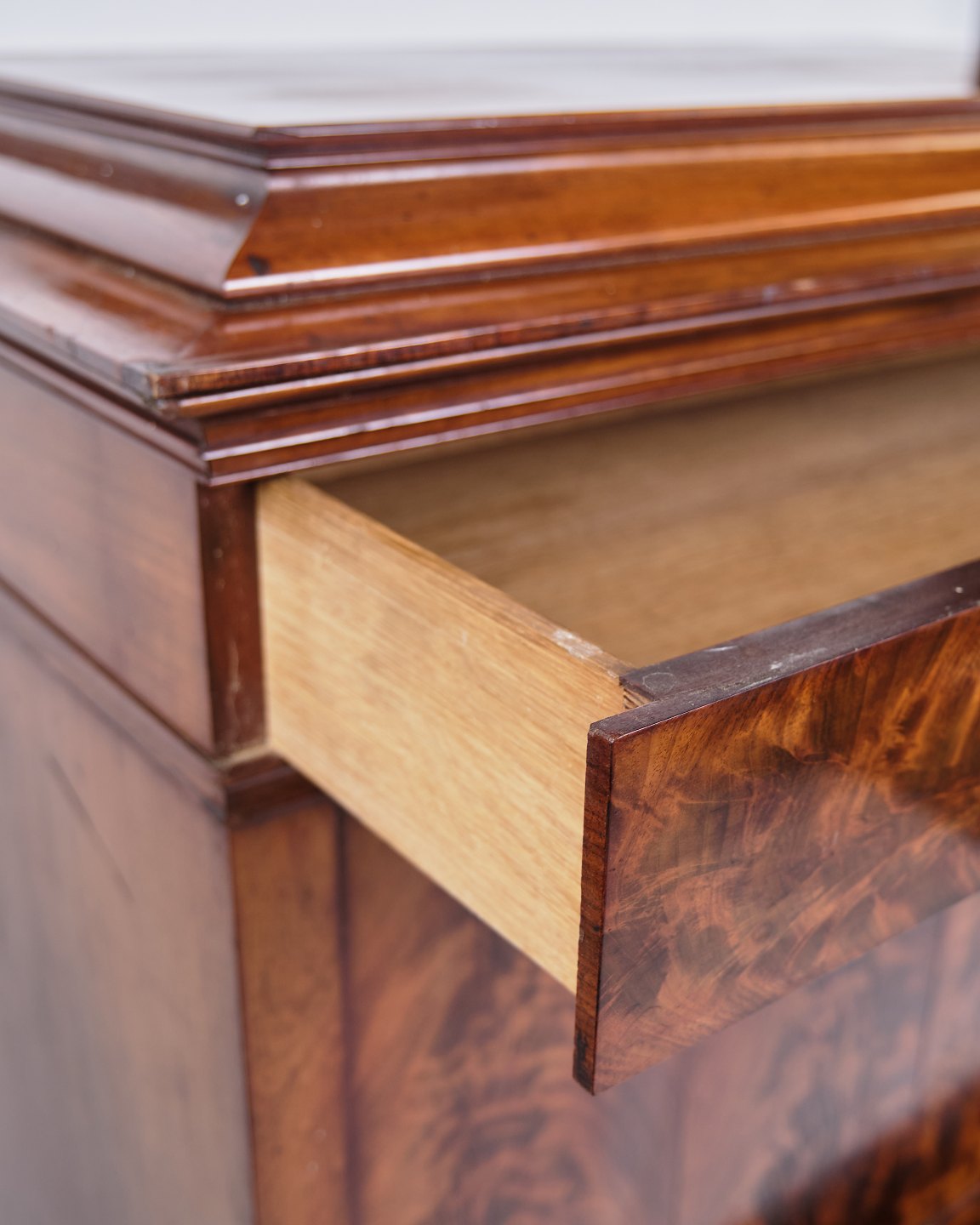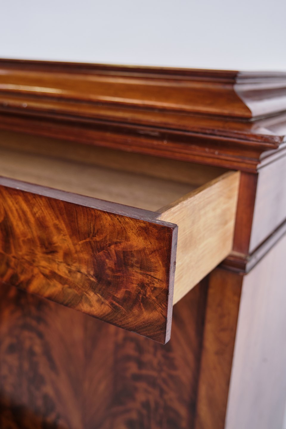 Antik chiffonier fra 1840’erne. Mahogni med intarsia, flamme struktur og 4 skuffer. H: 150 cm, B: 101 cm, D: 52 cm. Klassisk snedkerhåndværk.