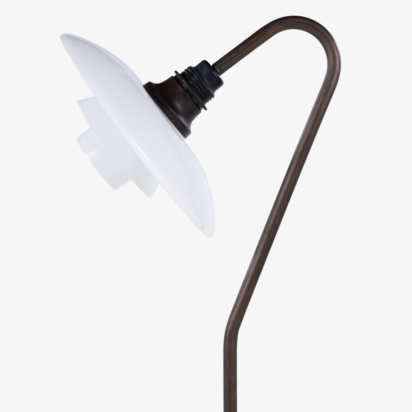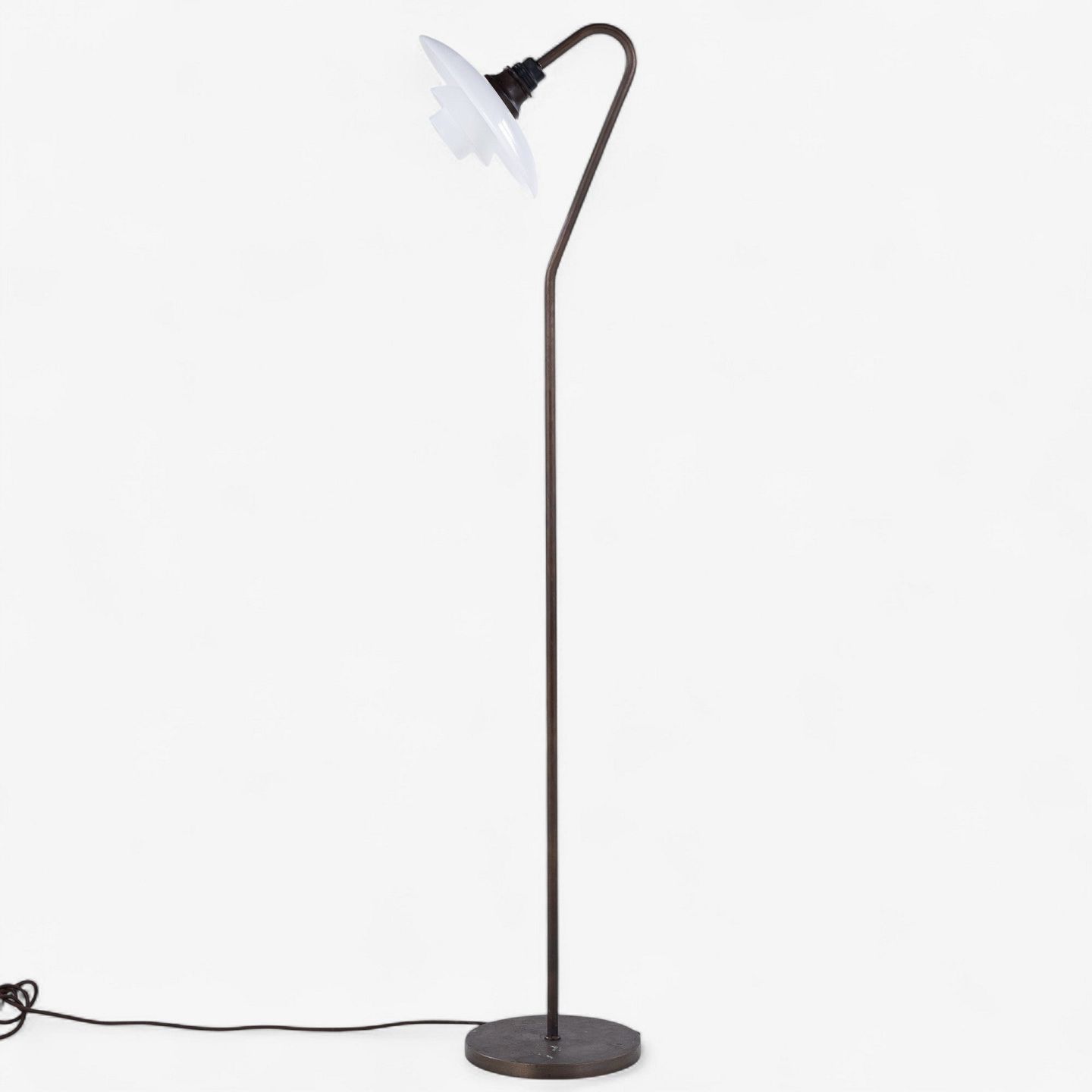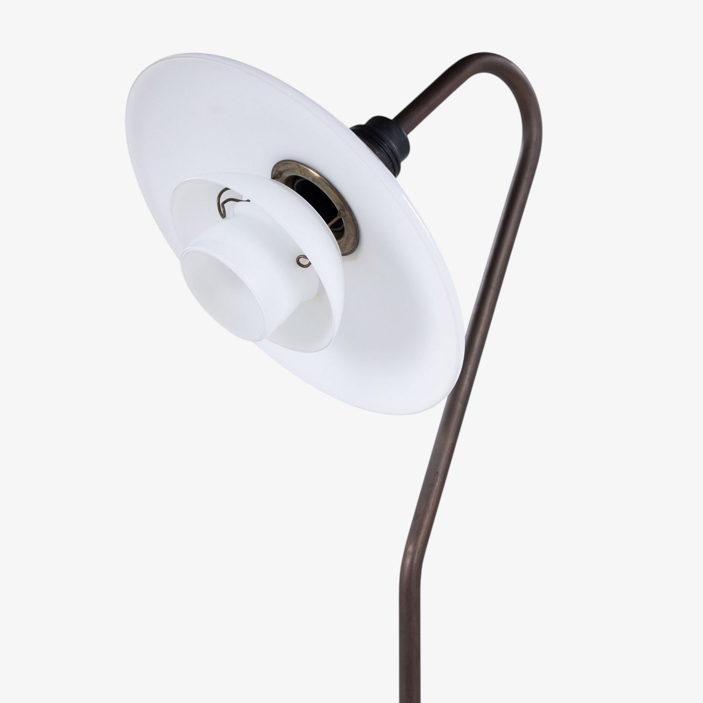 PH 3/2 - 'Syvtallet' gulvlampe med stel i bruneret messing og skærme i hvidt opalglas. Stemplet 'Patented'.