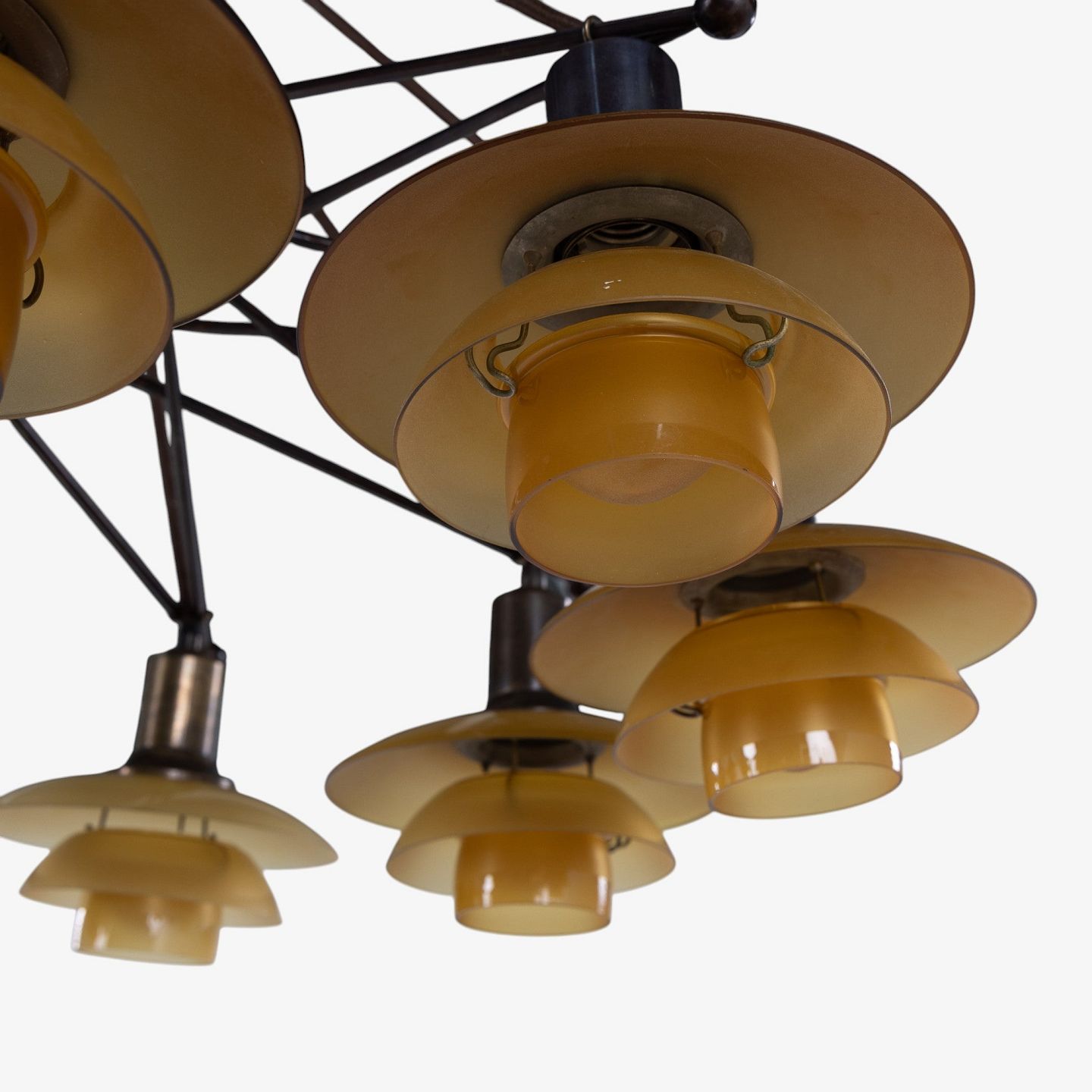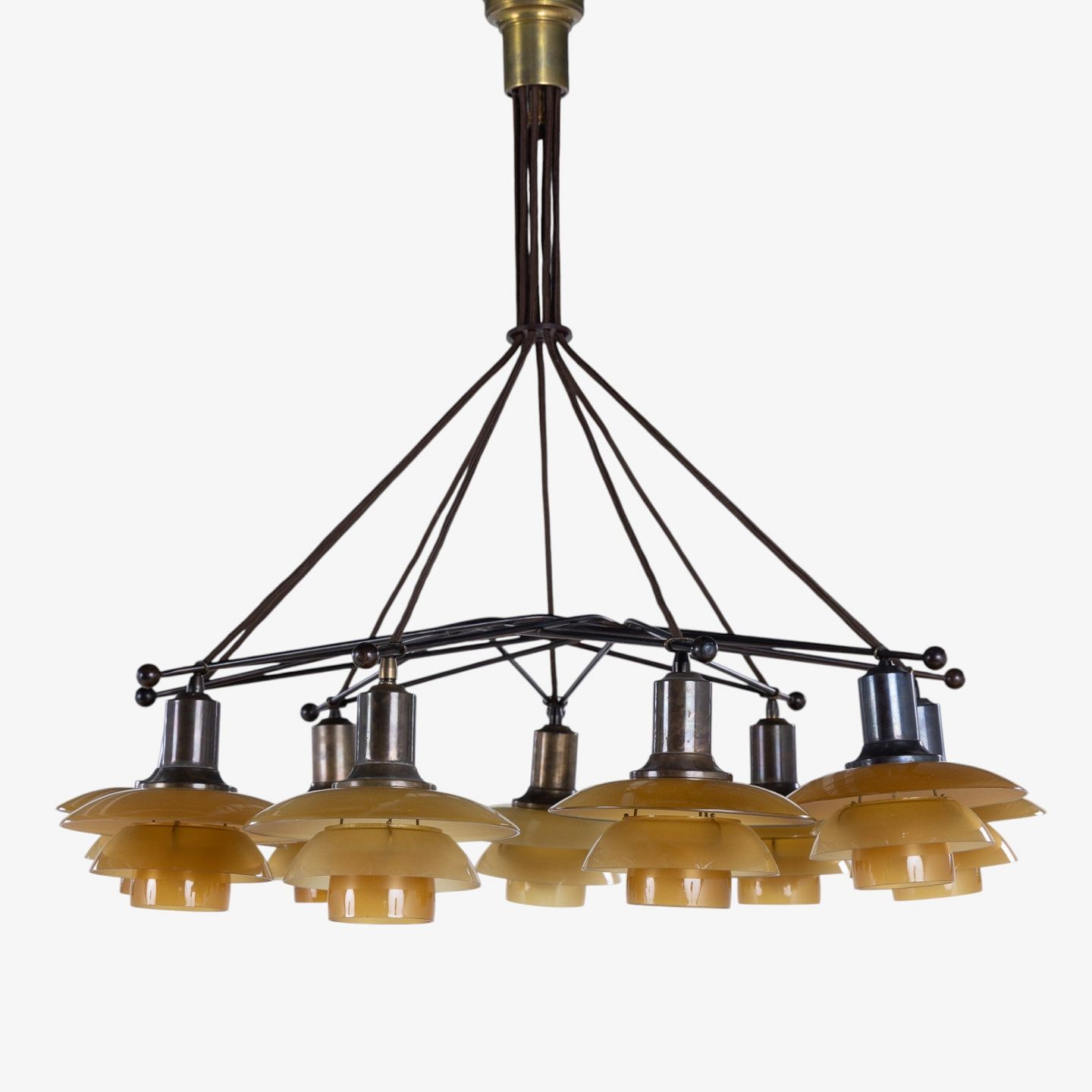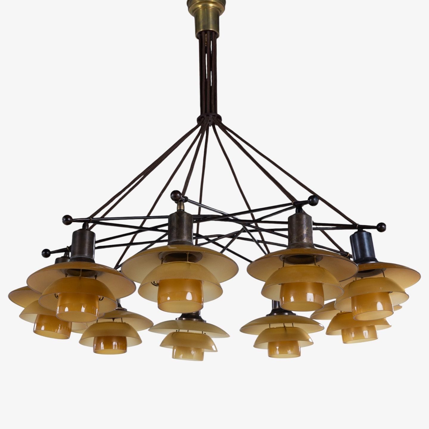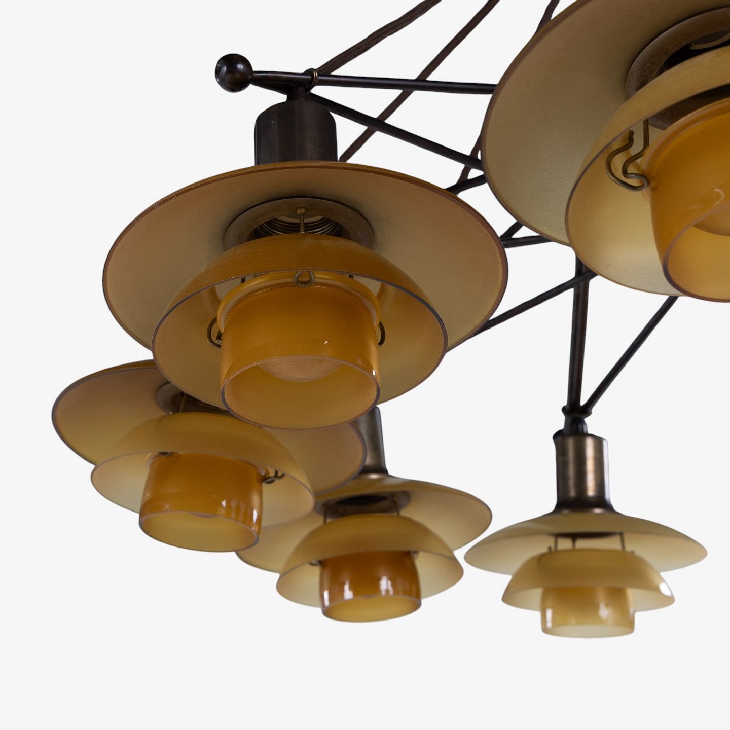 PH 2/2 - Sjælden 'Stjernekrone' i bruneret messing med skærme i ravfarvet glas. Stemplet 'Patented'.